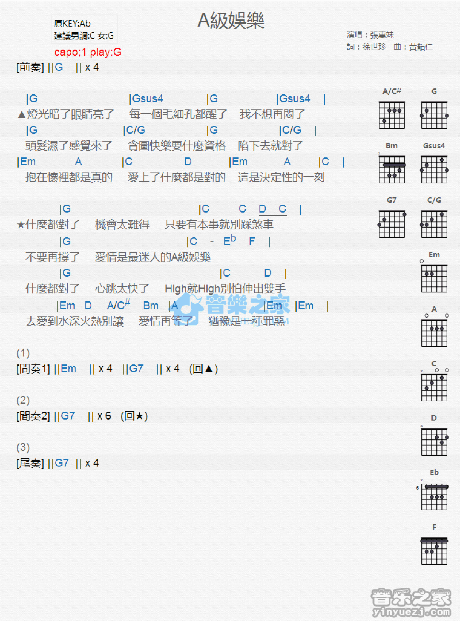 曲谱介绍: G调版 张惠妹《A级娱乐》吉他和弦弹唱谱