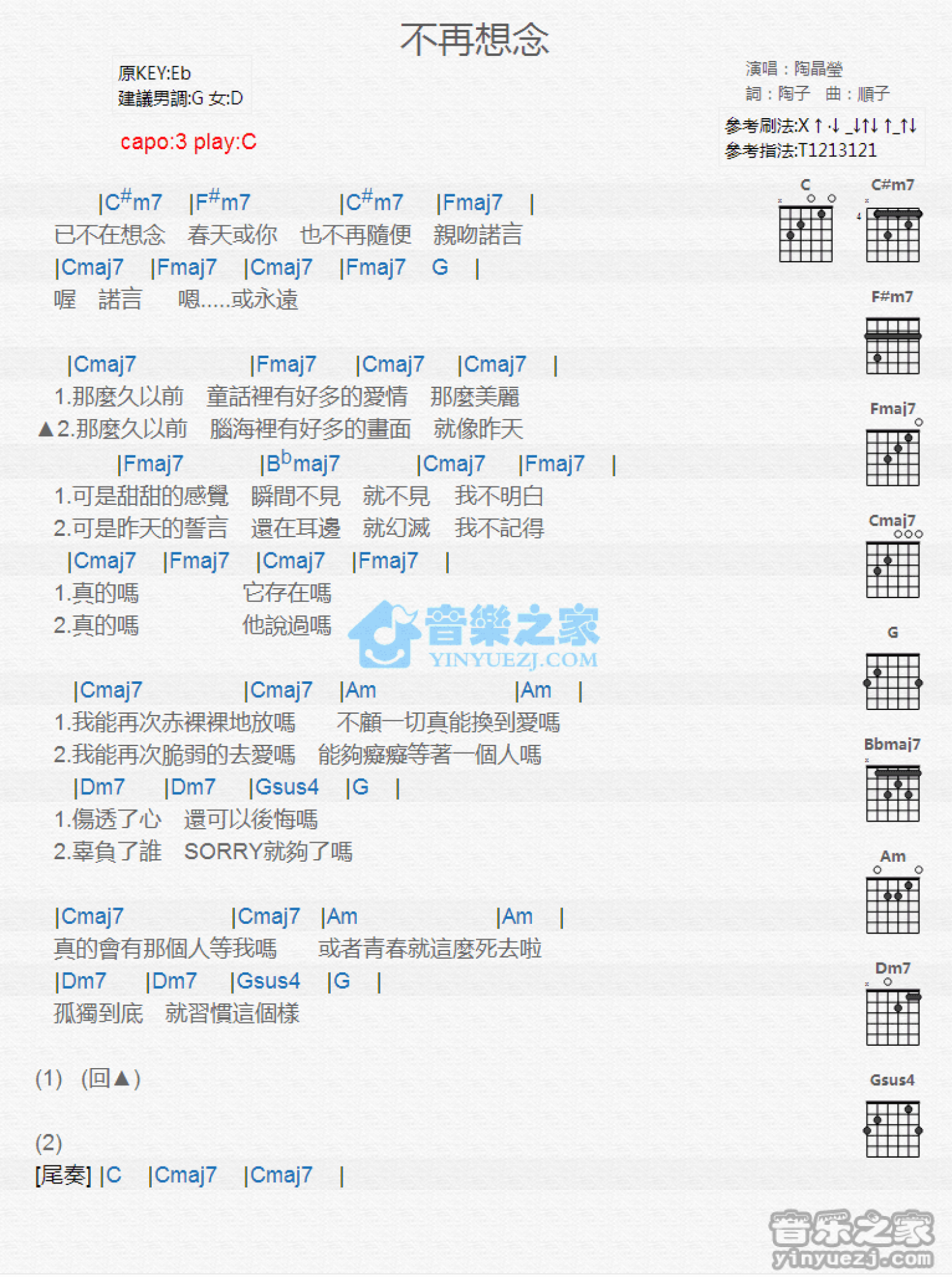 不再想念吉他谱 - 陶晶莹 - C调吉他弹唱谱 - 和弦谱