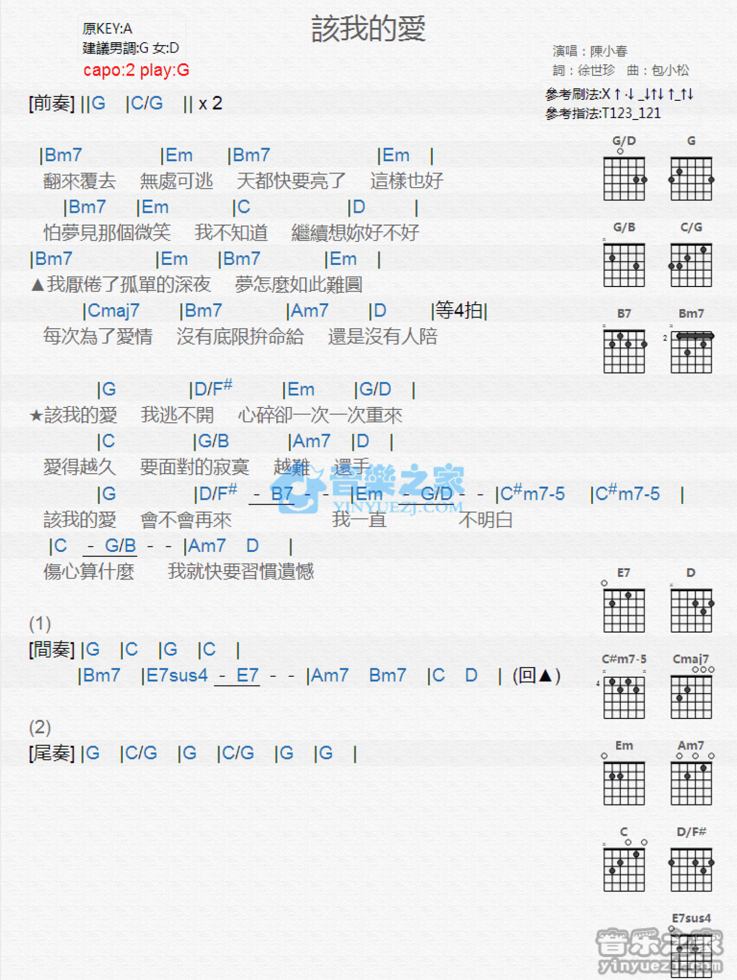 曲谱介绍: G调版《该我的爱》吉他和弦弹唱谱