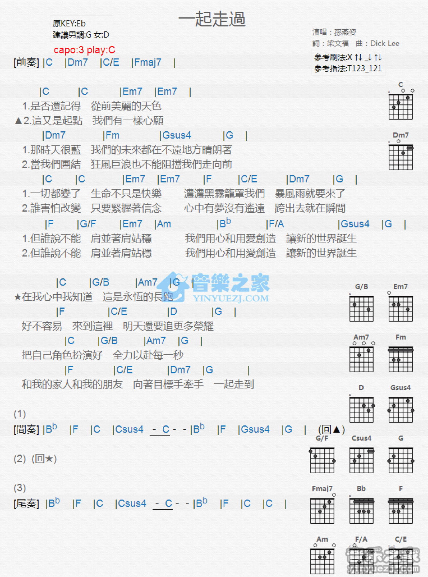 曲谱介绍: C调版 孙燕姿《一起走过》吉他和弦弹唱谱
