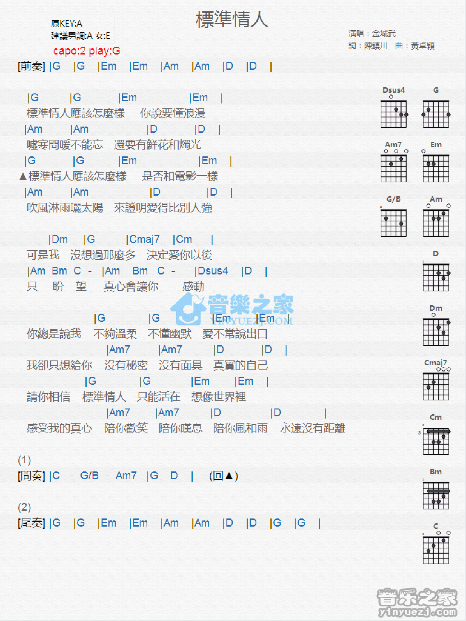 曲谱介绍: G调版 金城武《标准情人》吉他和弦弹唱谱