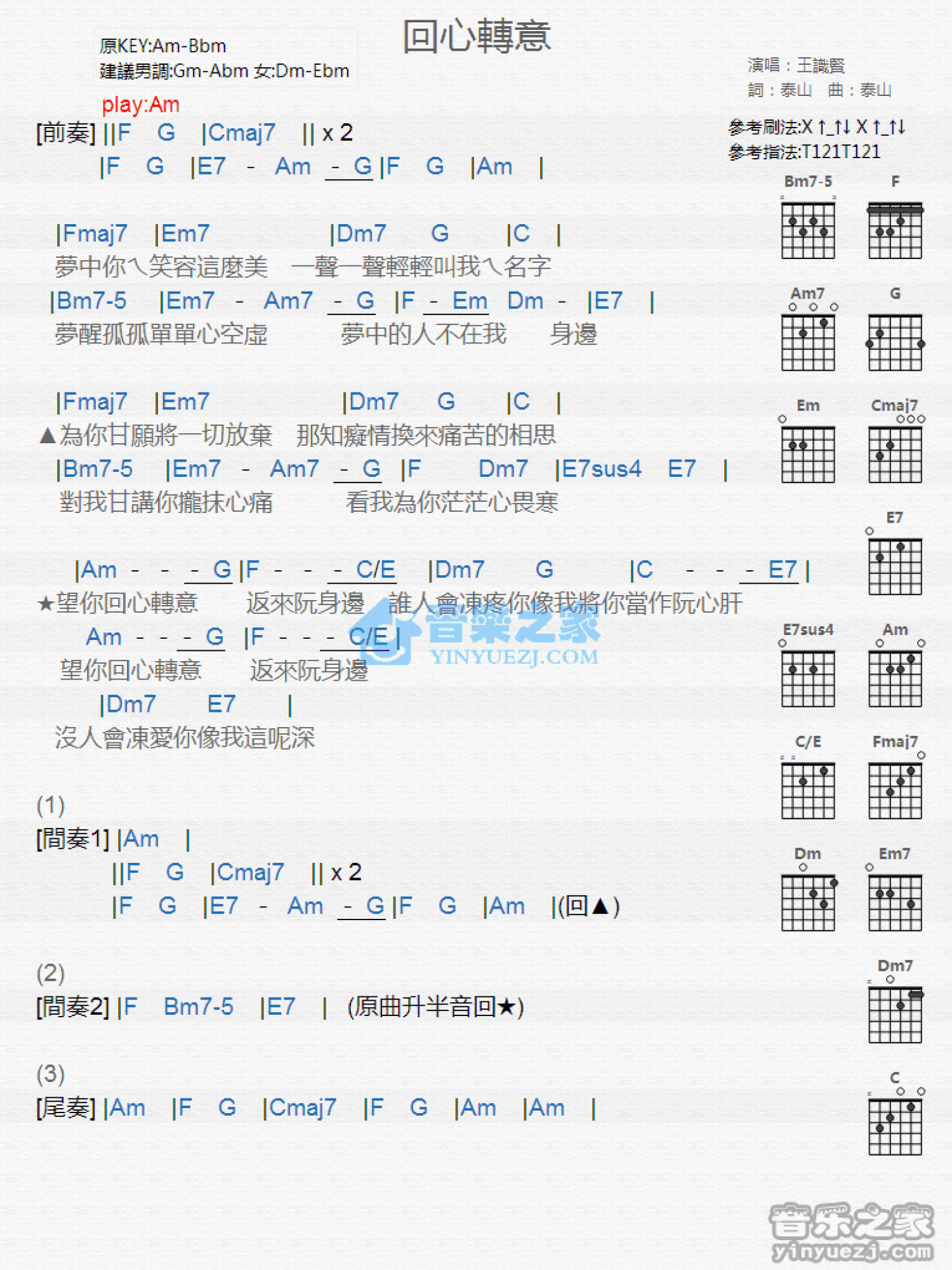 曲谱介绍: Am调版《回心转意》吉他和弦弹唱谱