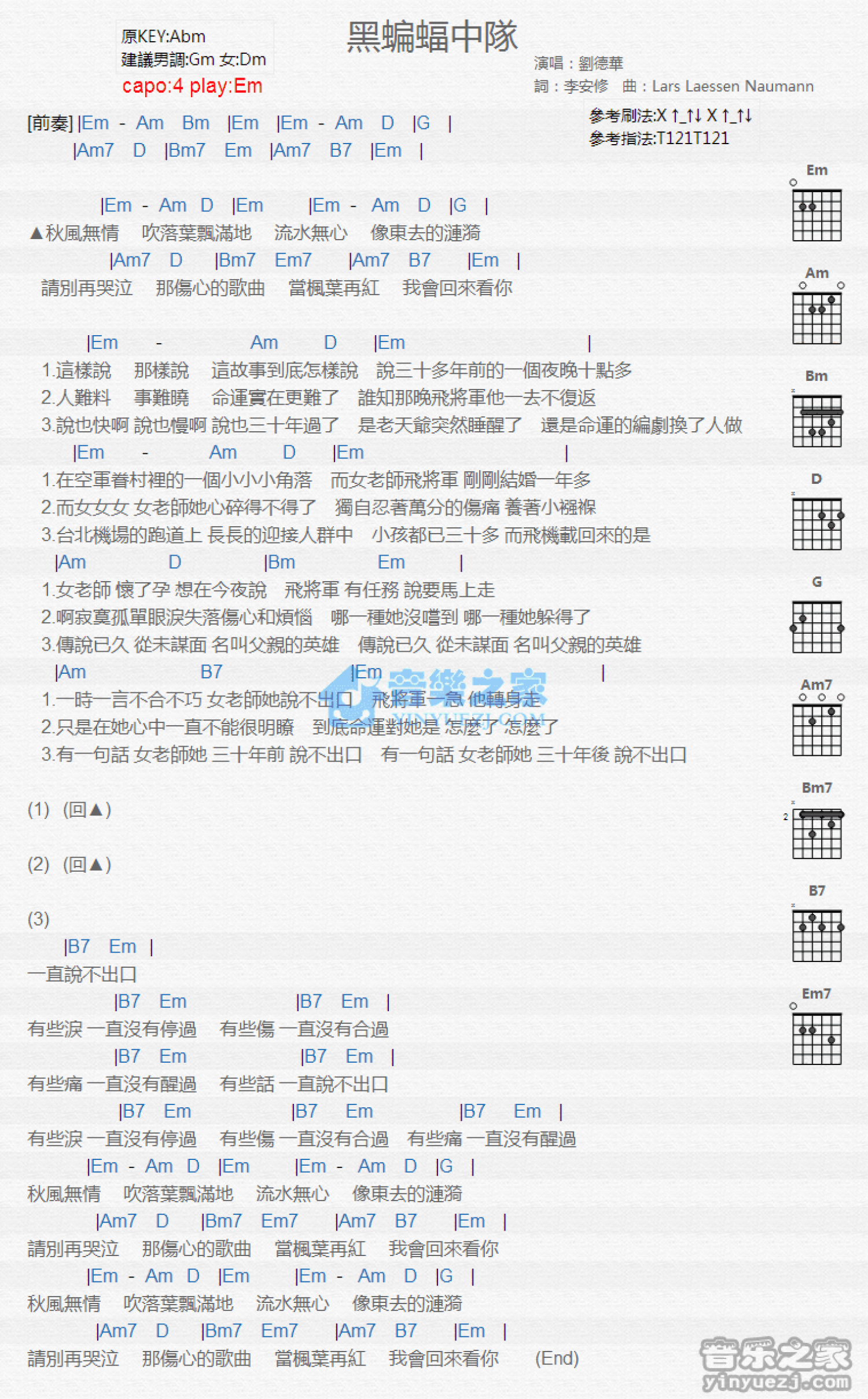 曲谱介绍: Em调版 刘德华《黑蝙蝠中队》吉他和弦弹唱谱