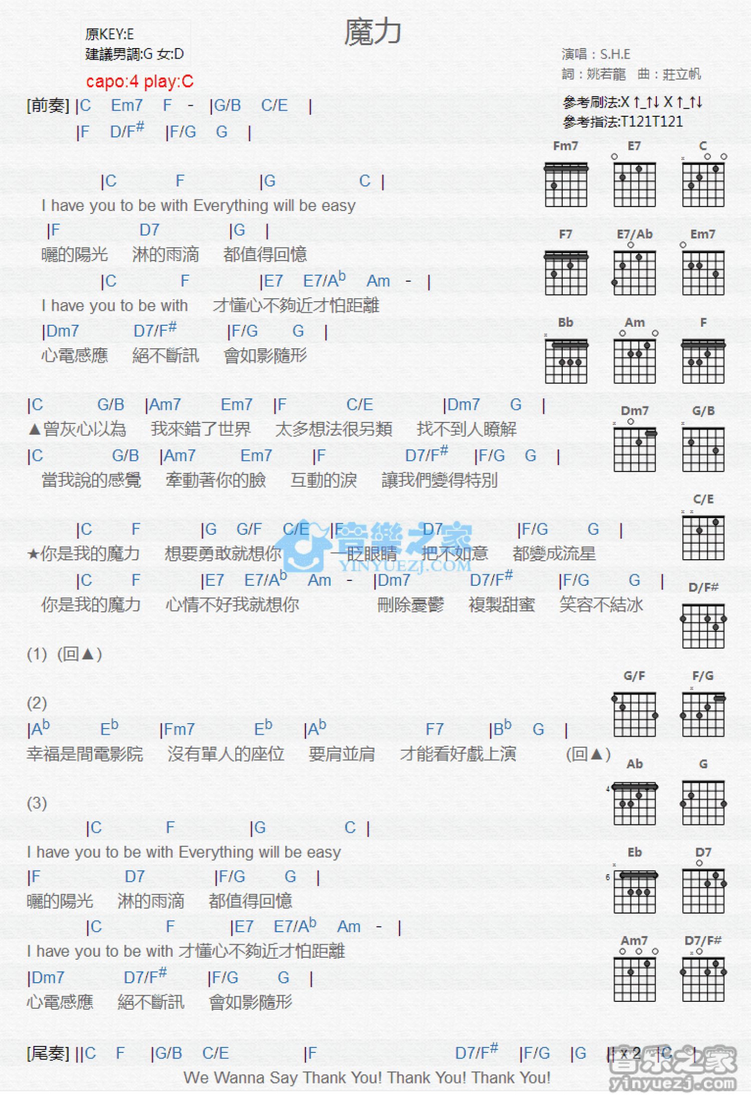 曲谱介绍: C调版 S.H.E《魔力》吉他和弦弹唱谱