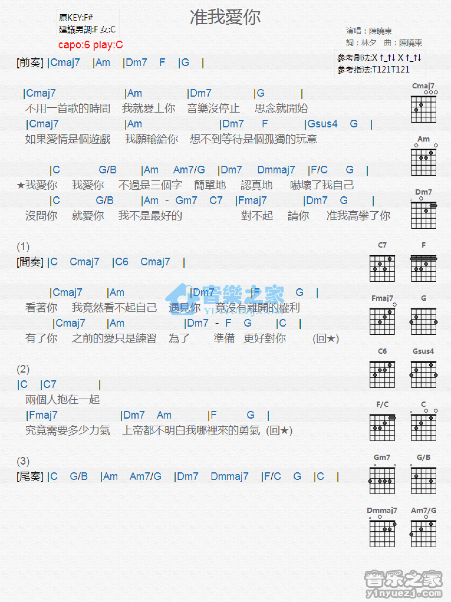 曲谱介绍: C调版《准我爱你》吉他和弦弹唱谱