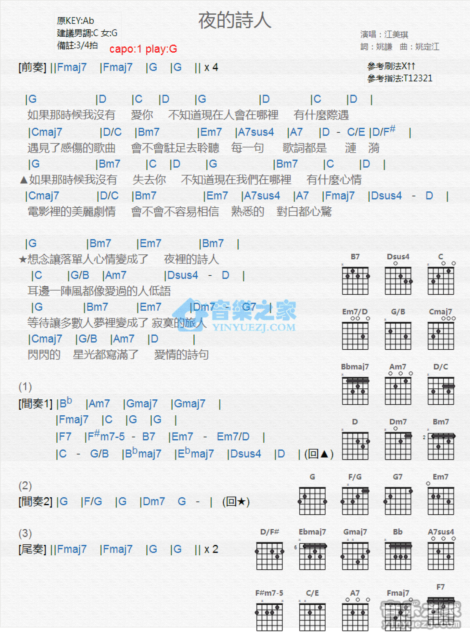 曲谱介绍: G调版江美琪《夜的诗人》吉他和弦弹唱谱