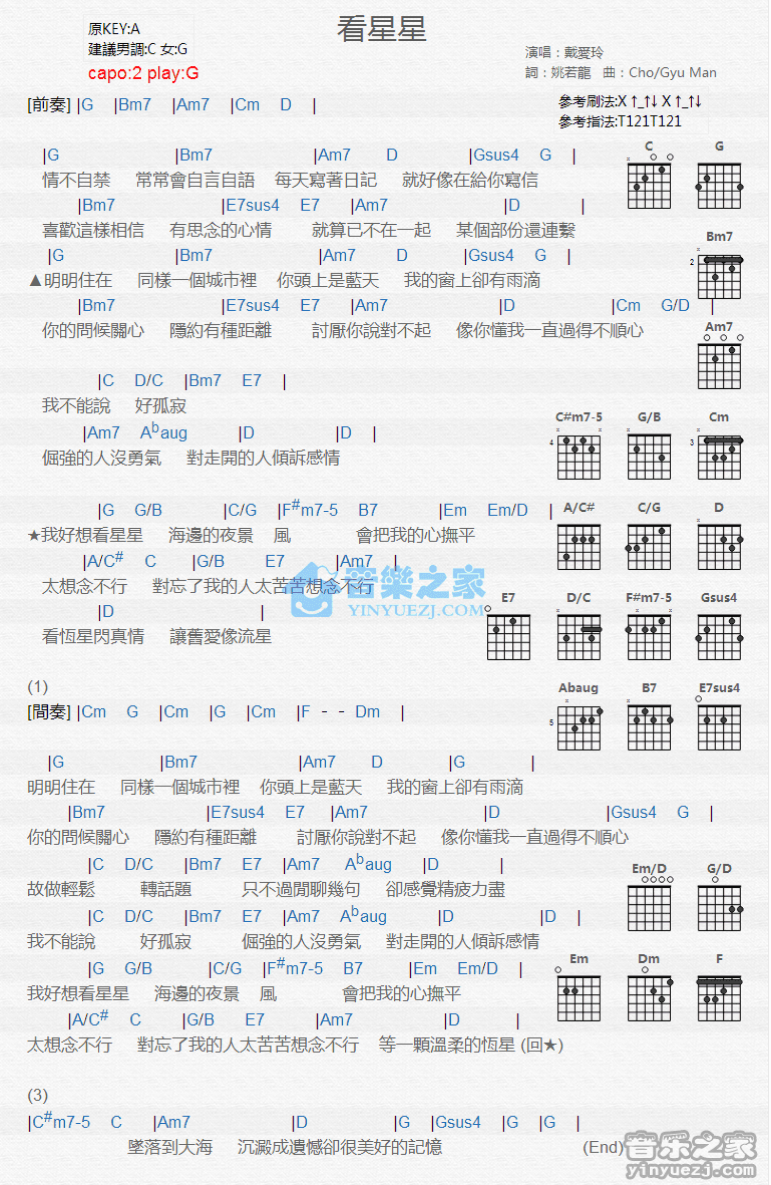 曲谱介绍: G调版 戴爱玲《看星星》吉他和弦弹唱谱