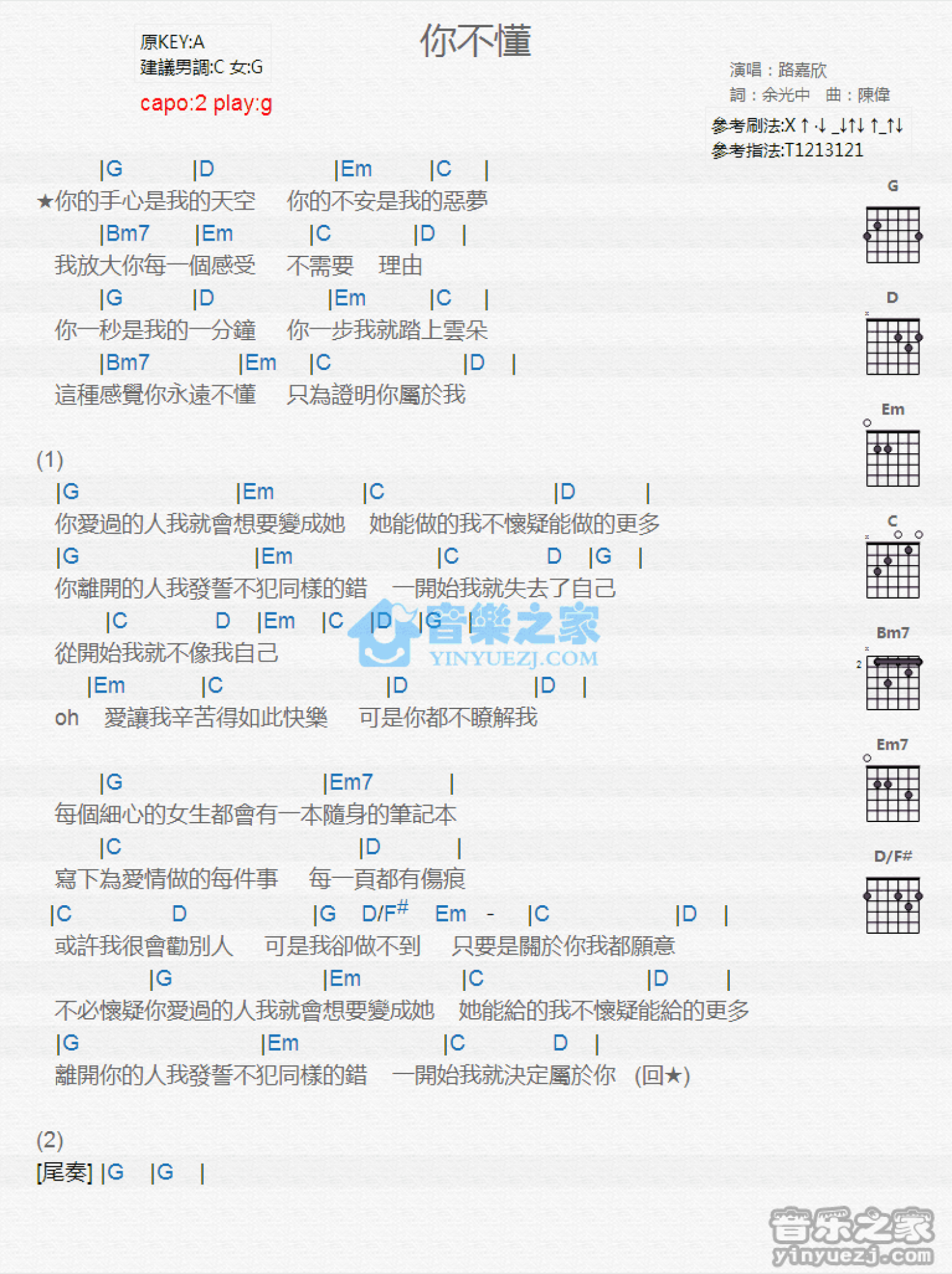 曲谱介绍: G调版 路嘉欣《你不懂》吉他和弦弹唱谱