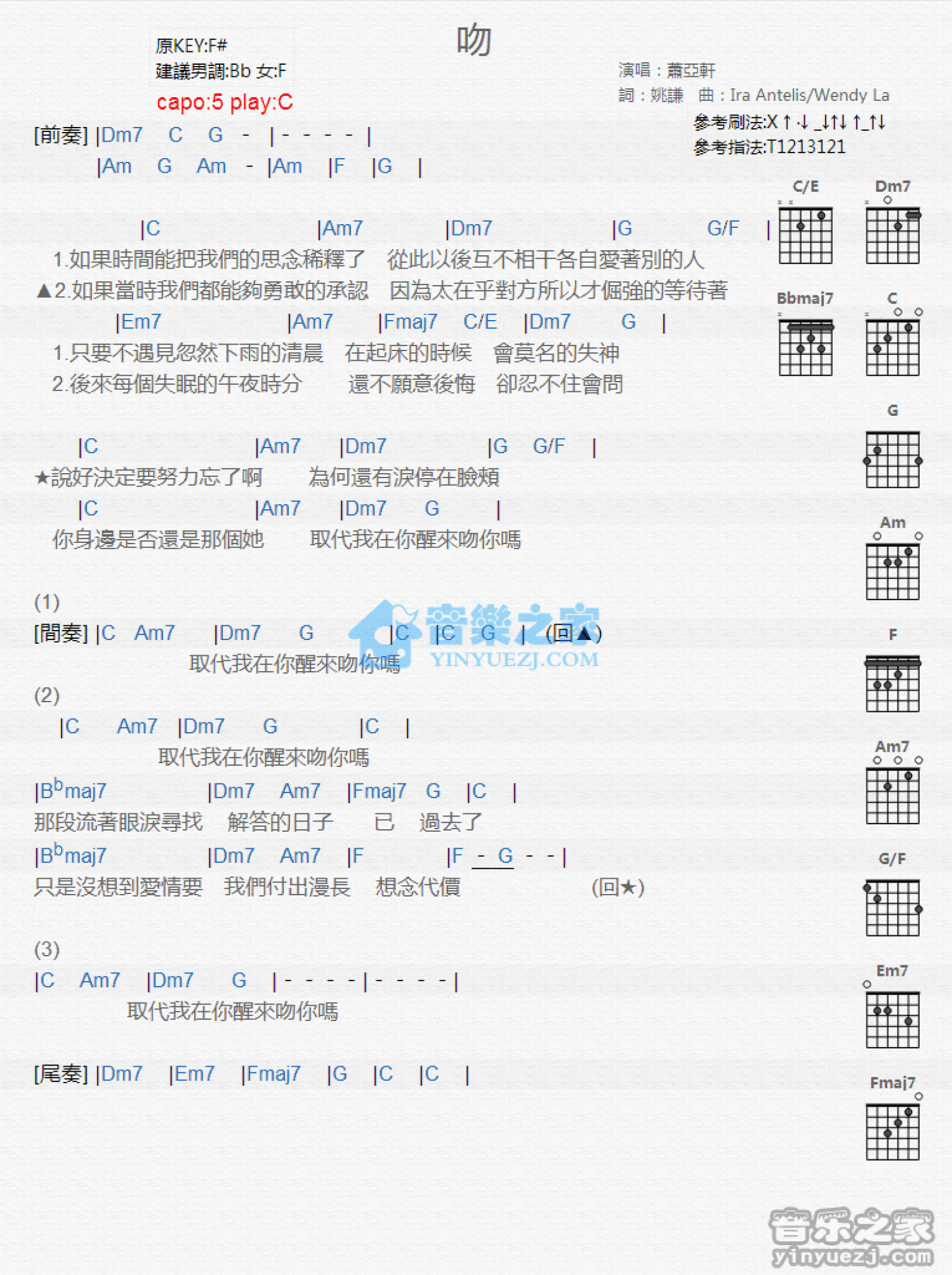 曲谱介绍: C调版萧亚轩《吻》吉他和弦弹唱谱