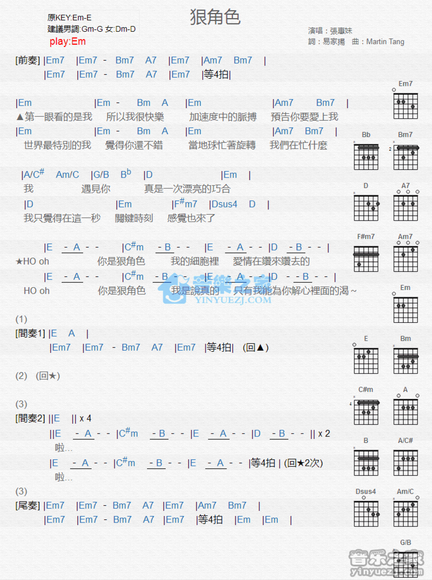 曲谱介绍: Em调版 张惠妹《狠角色》吉他和弦弹唱谱