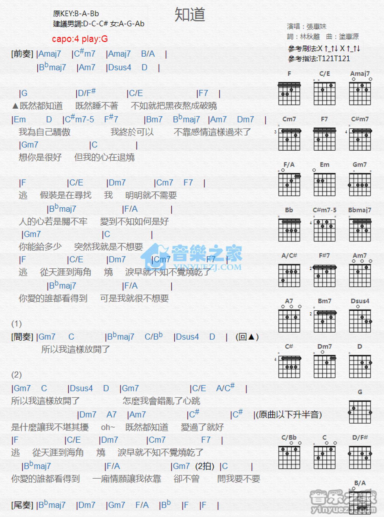 曲谱介绍: G调版 张惠妹《知道》吉他和弦弹唱谱
