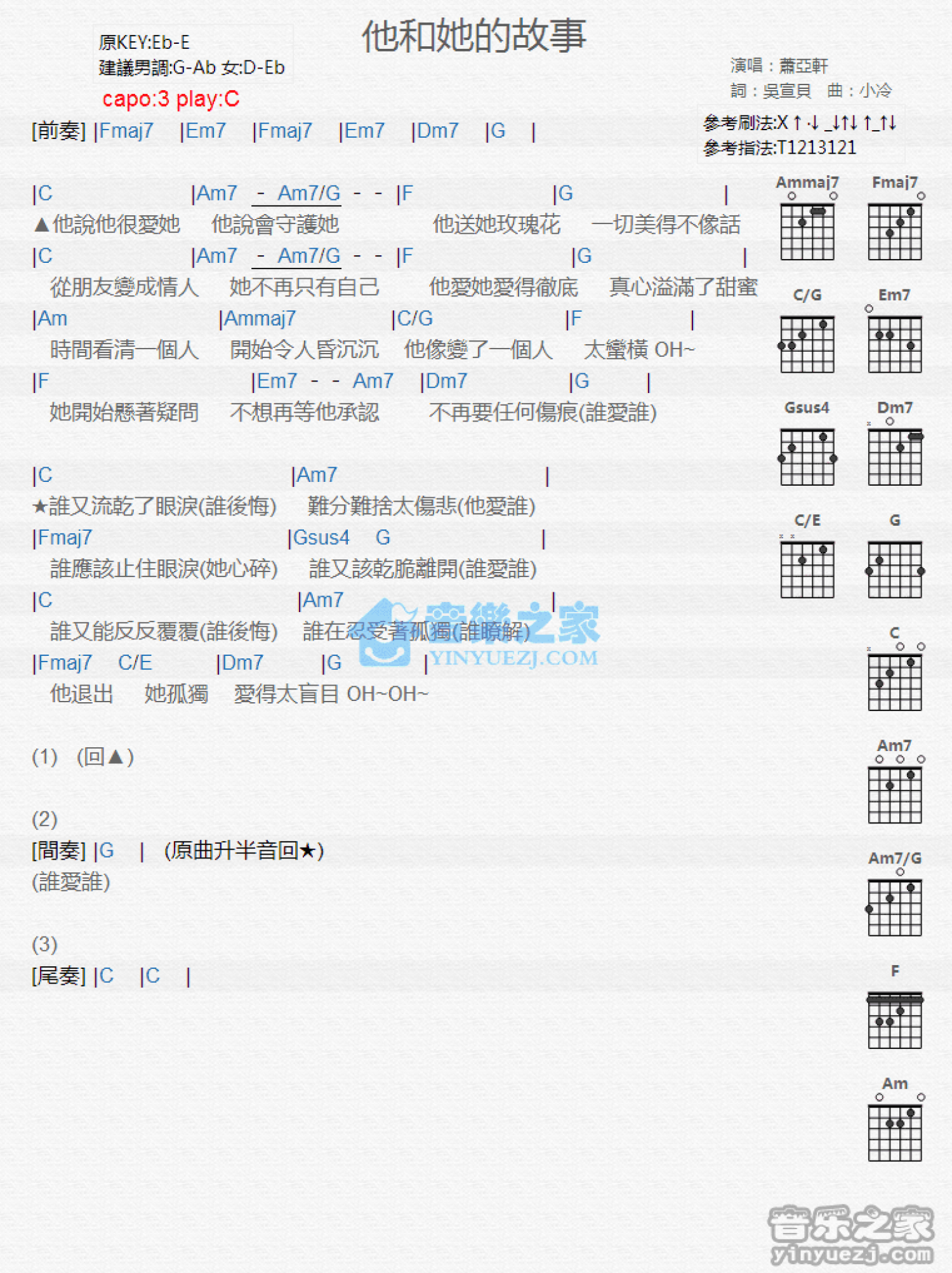 曲谱介绍: C调版 萧亚轩《他和她的故事》吉他和弦弹唱谱
