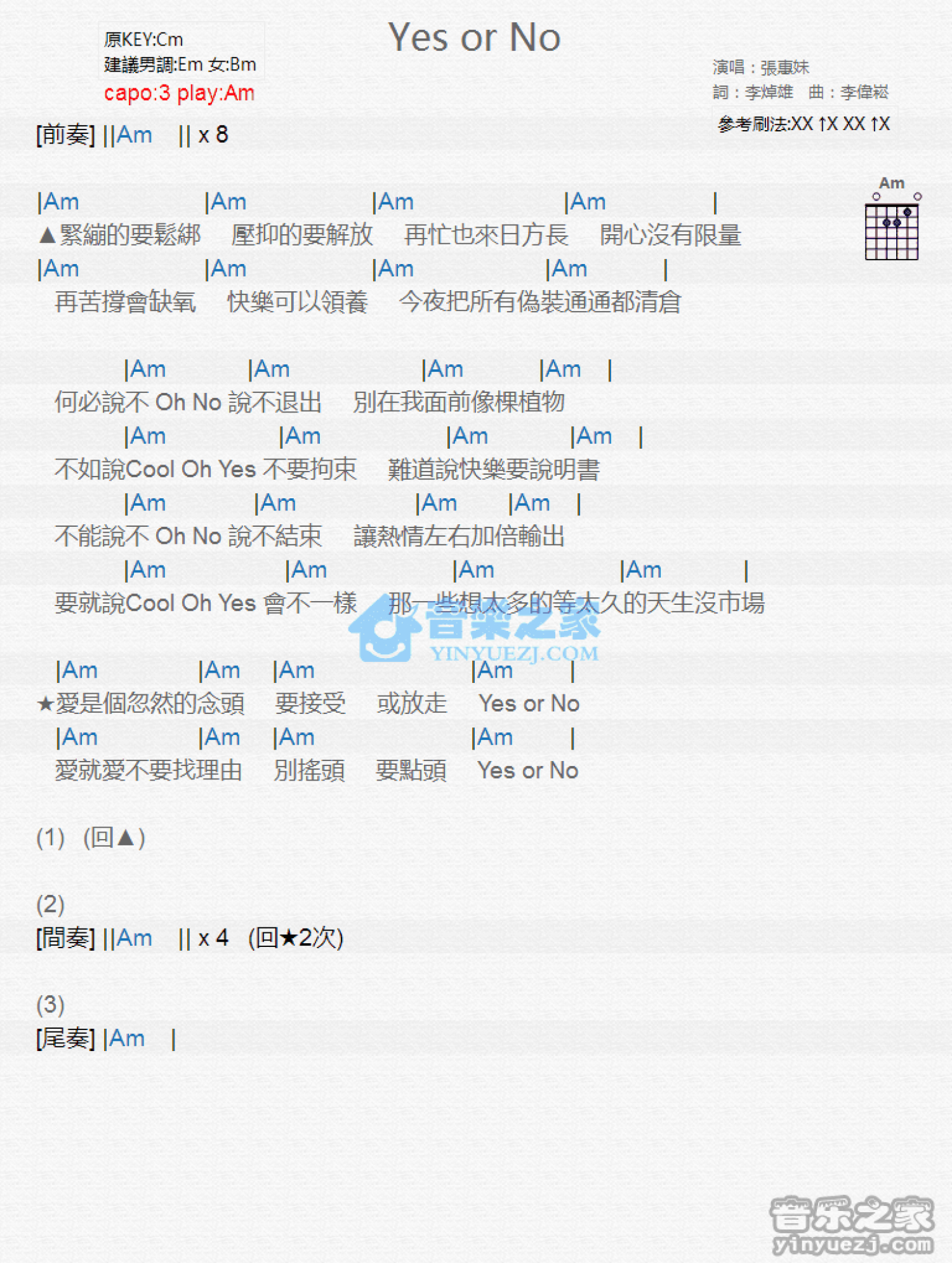 曲谱介绍: Am调版《YesOrNo》吉他和弦弹唱谱
