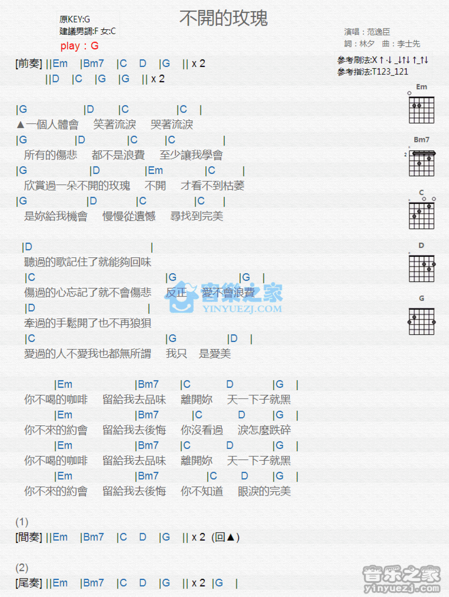 曲谱介绍: G调版 范逸臣《不开的玫瑰》吉他和弦弹唱谱