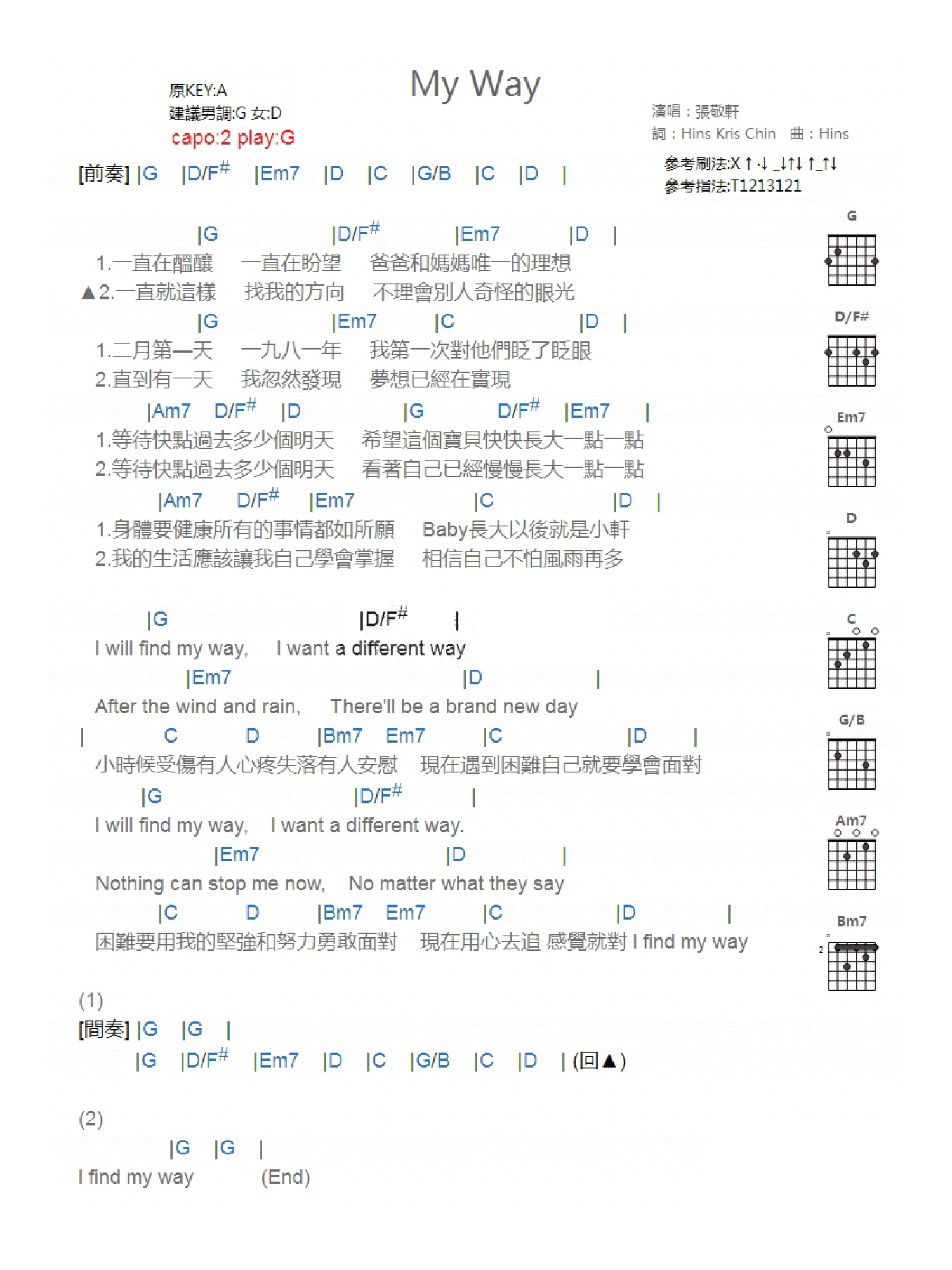 曲谱介绍: G调版 张敬轩《My Way》吉他和弦弹唱谱