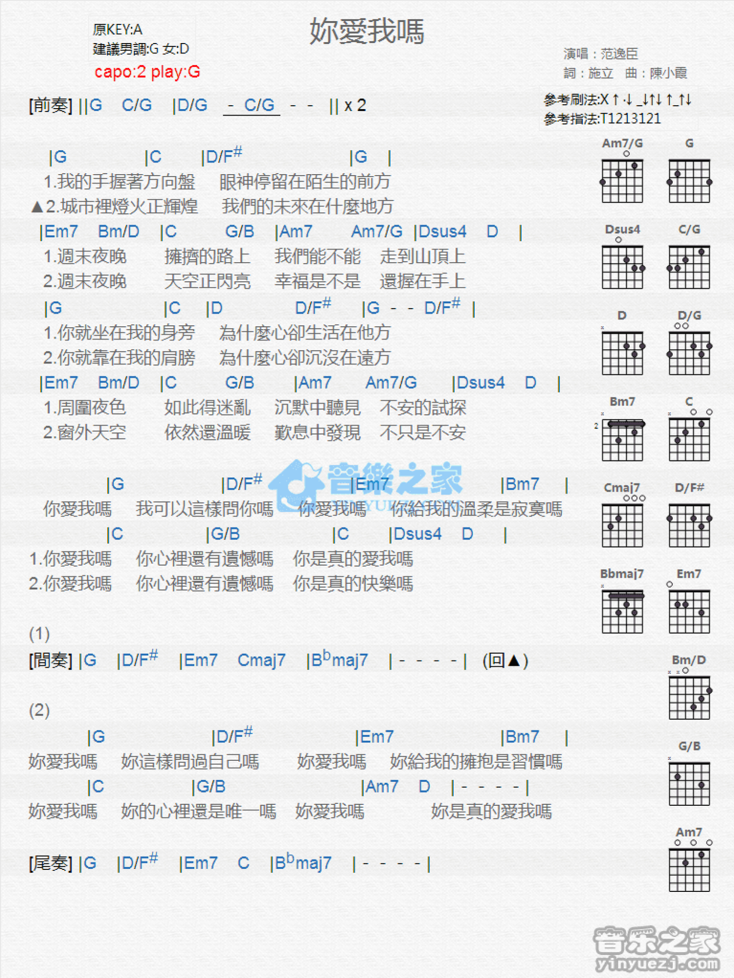 曲谱介绍: G调版 范逸臣《你爱我吗》吉他和弦弹唱谱