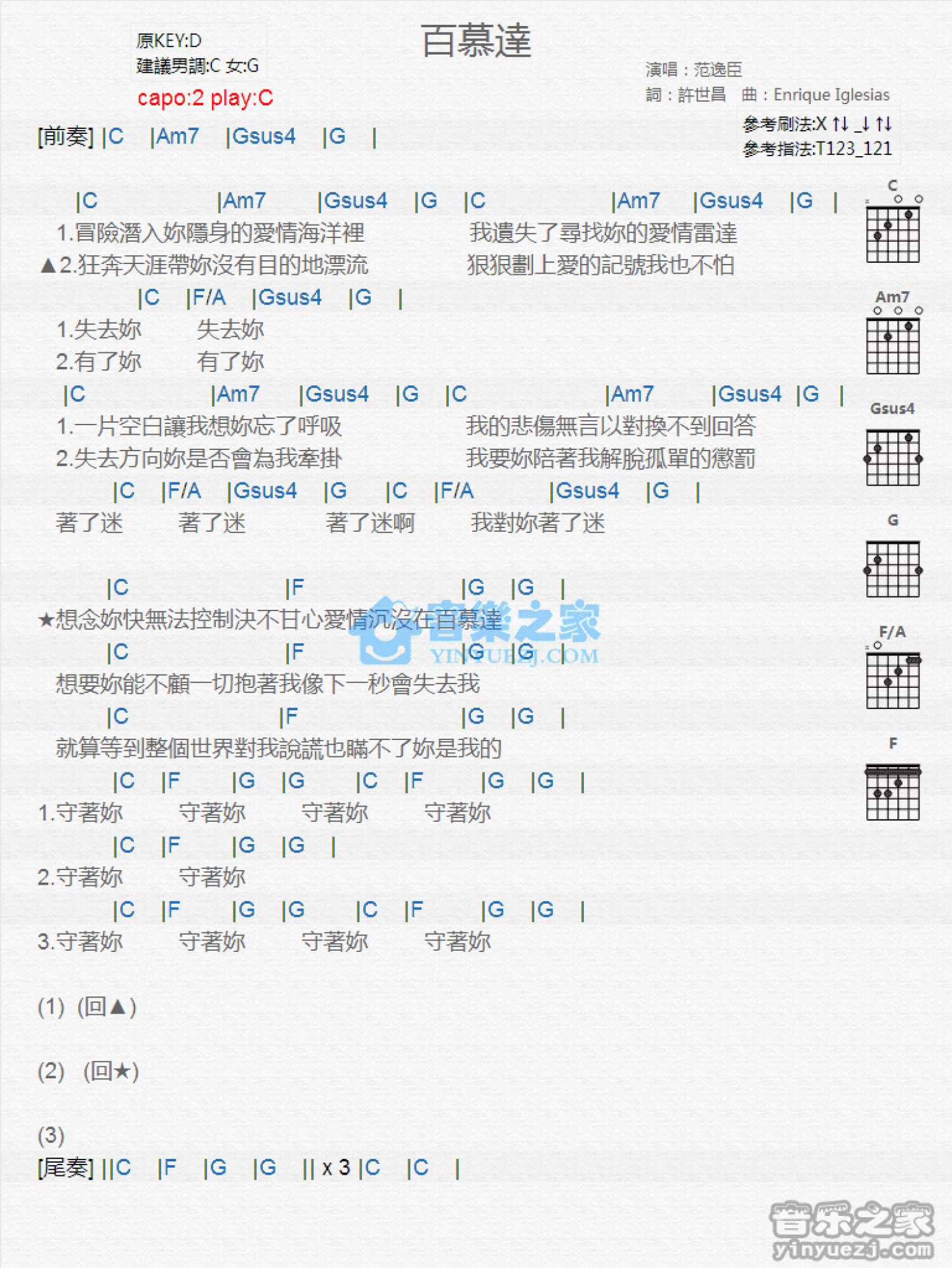 曲谱介绍: C调版 范逸臣《百慕达》吉他和弦弹唱谱