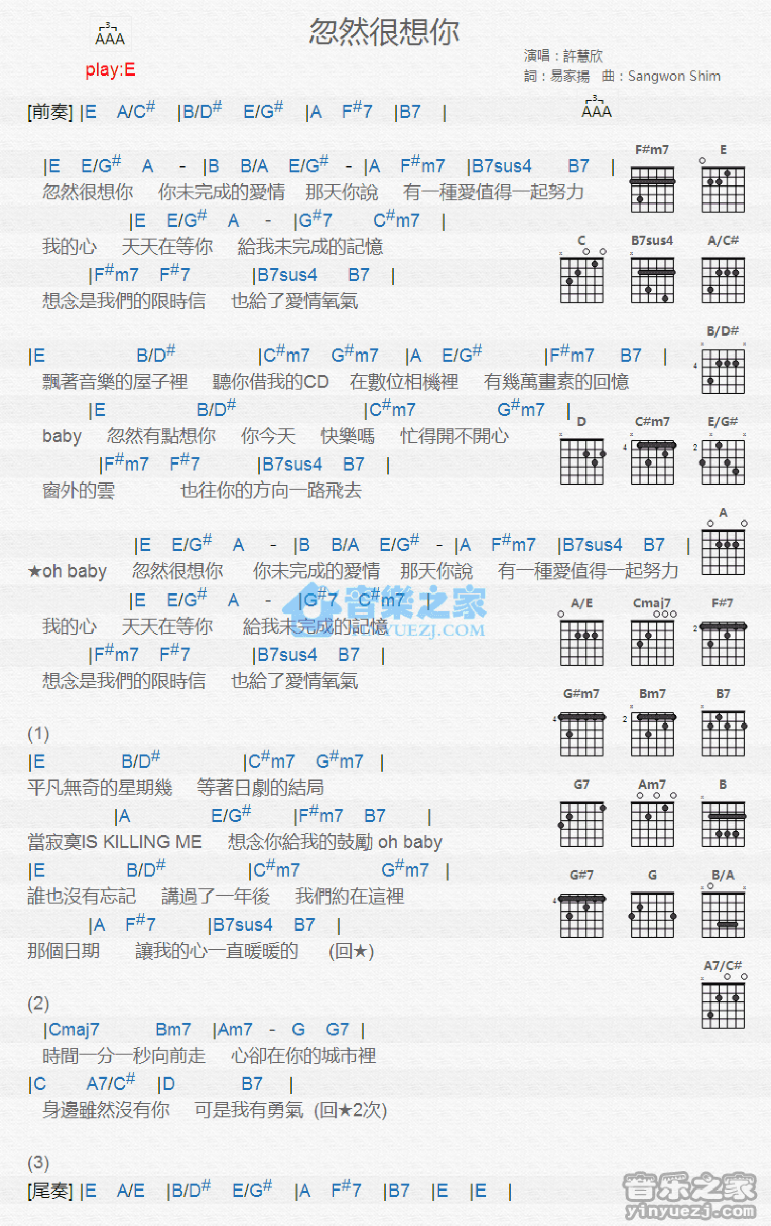 曲谱介绍: E调版 许慧欣《忽然很想你》吉他和弦弹唱谱