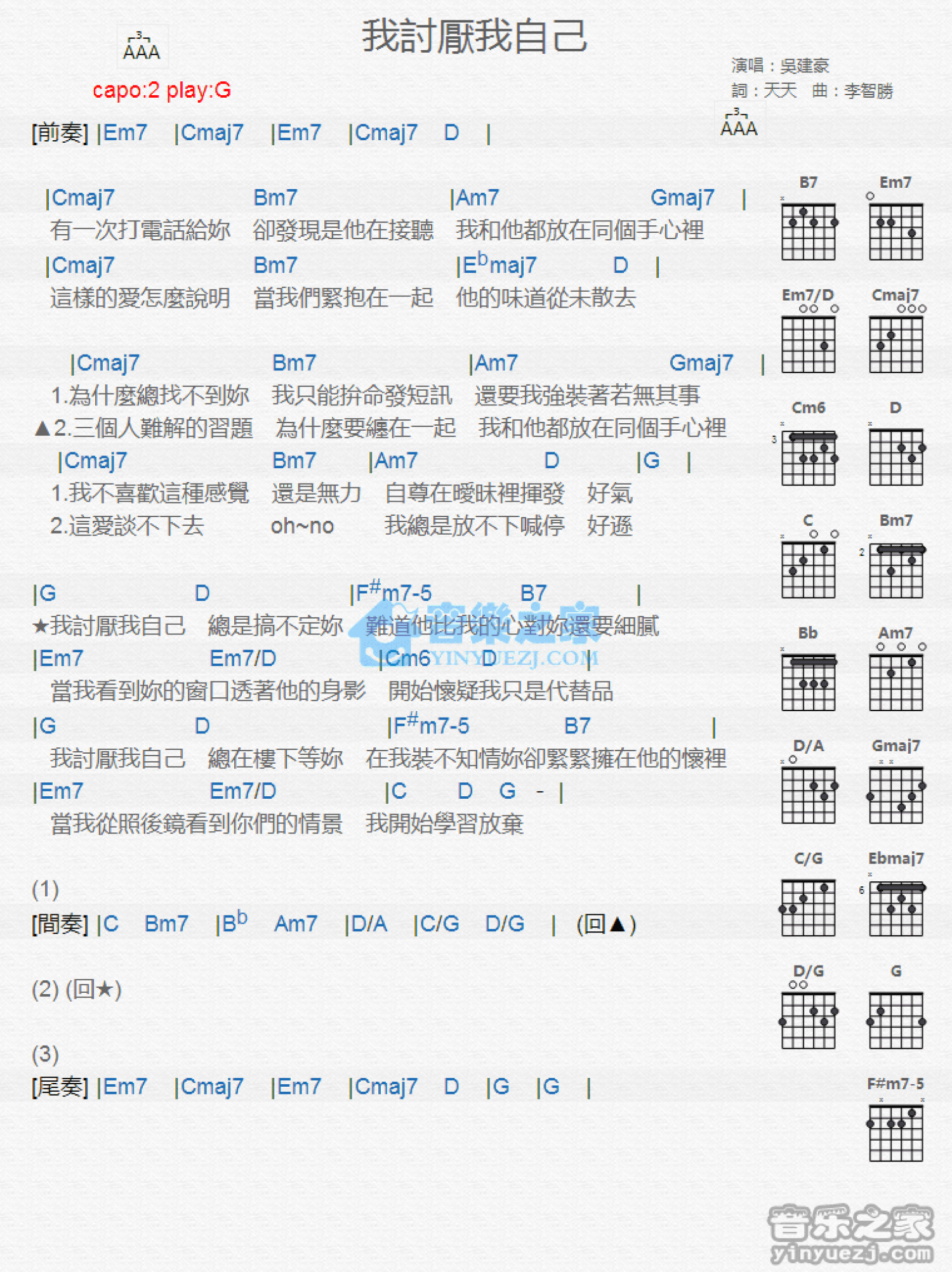 曲谱介绍: G调版《我讨厌我自己》吉他和弦弹唱谱