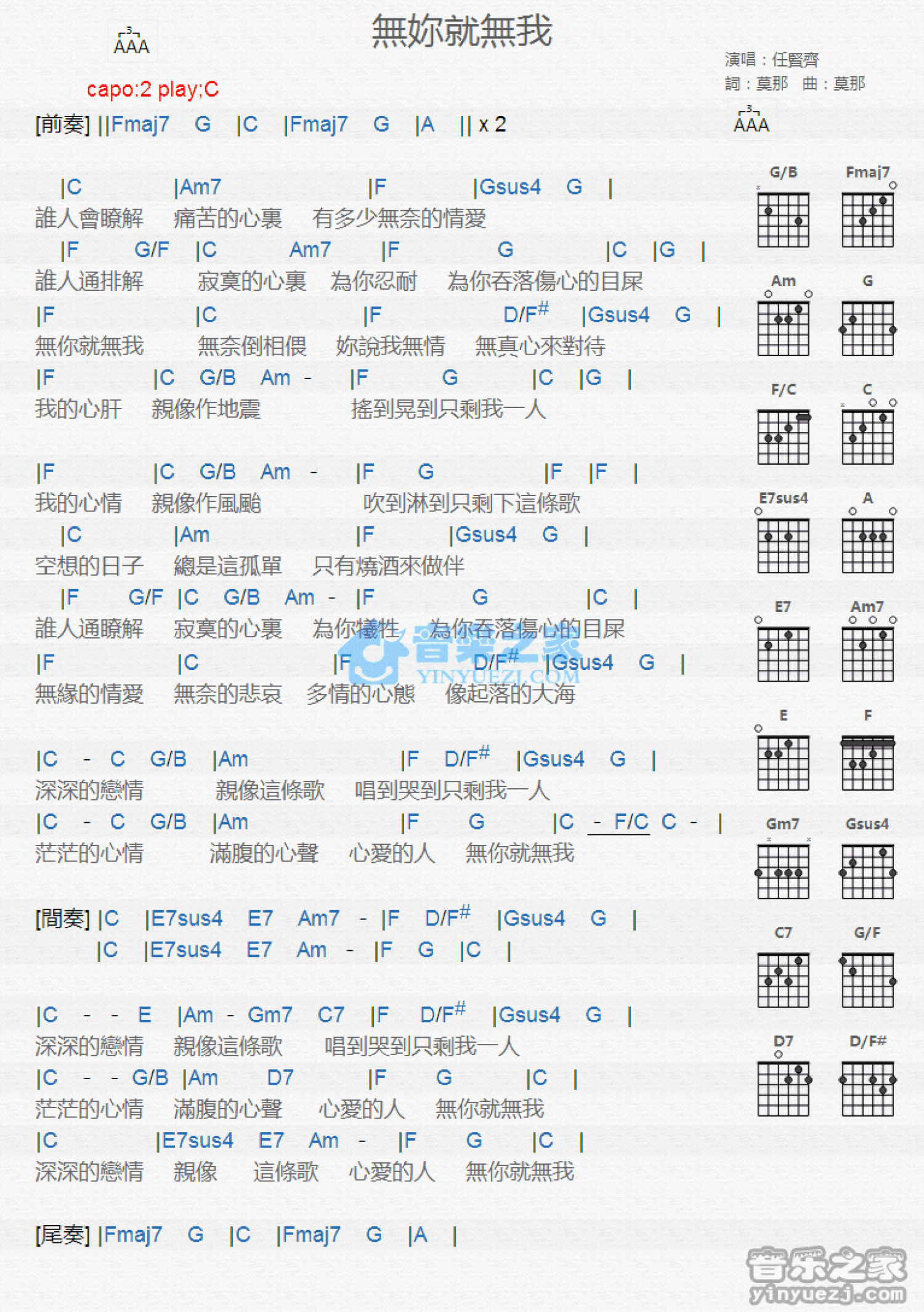 曲谱介绍: C调版《无你就无我》吉他和弦弹唱谱
