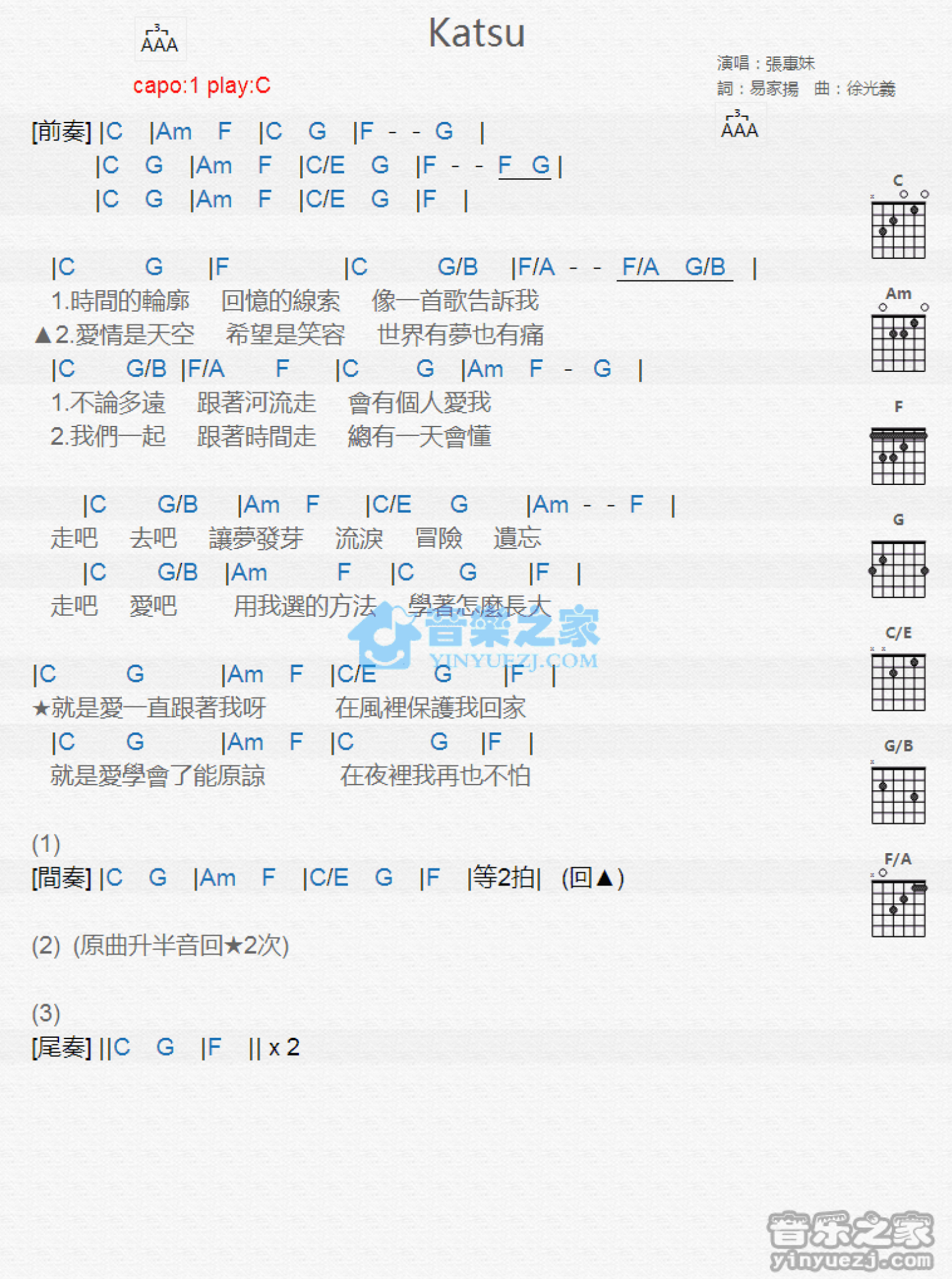 Katsu吉他谱 - 张惠妹 - C调吉他弹唱谱 - 和弦谱