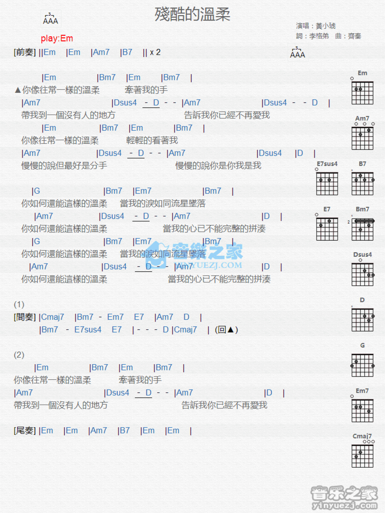 曲谱介绍: Em调版《残酷的温柔》吉他和弦弹唱谱