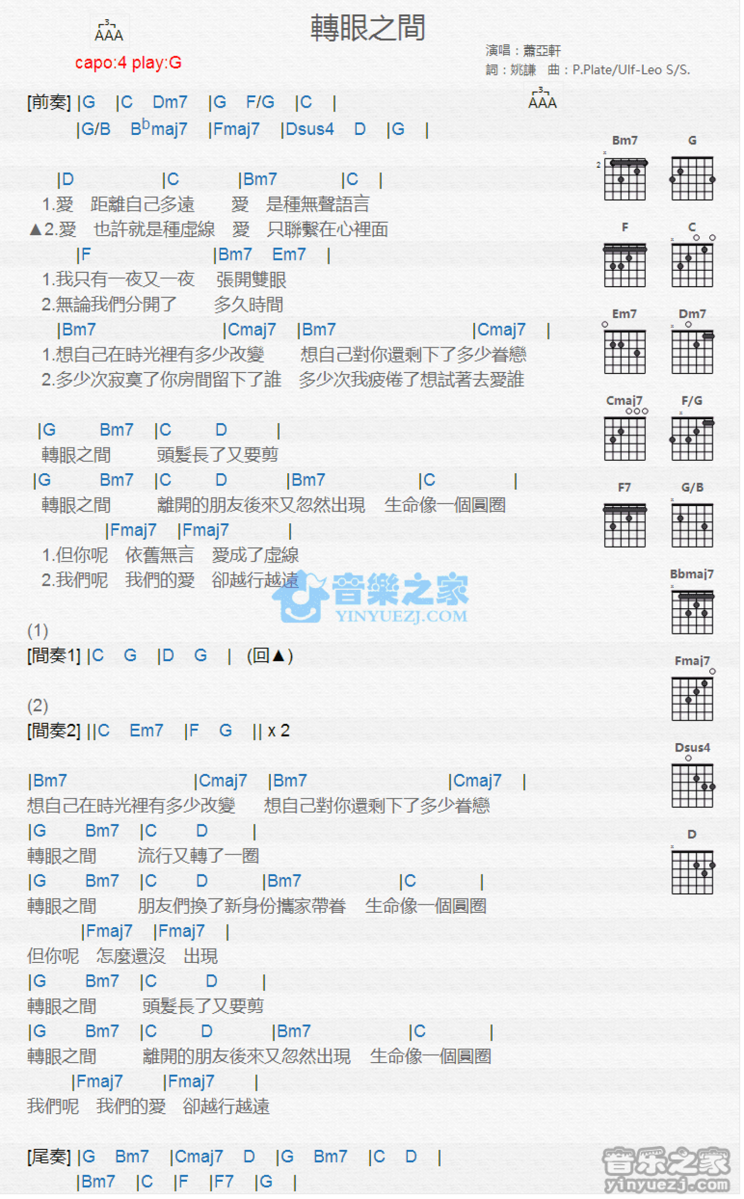 曲谱介绍: G调版《转眼之间》吉他和弦弹唱谱