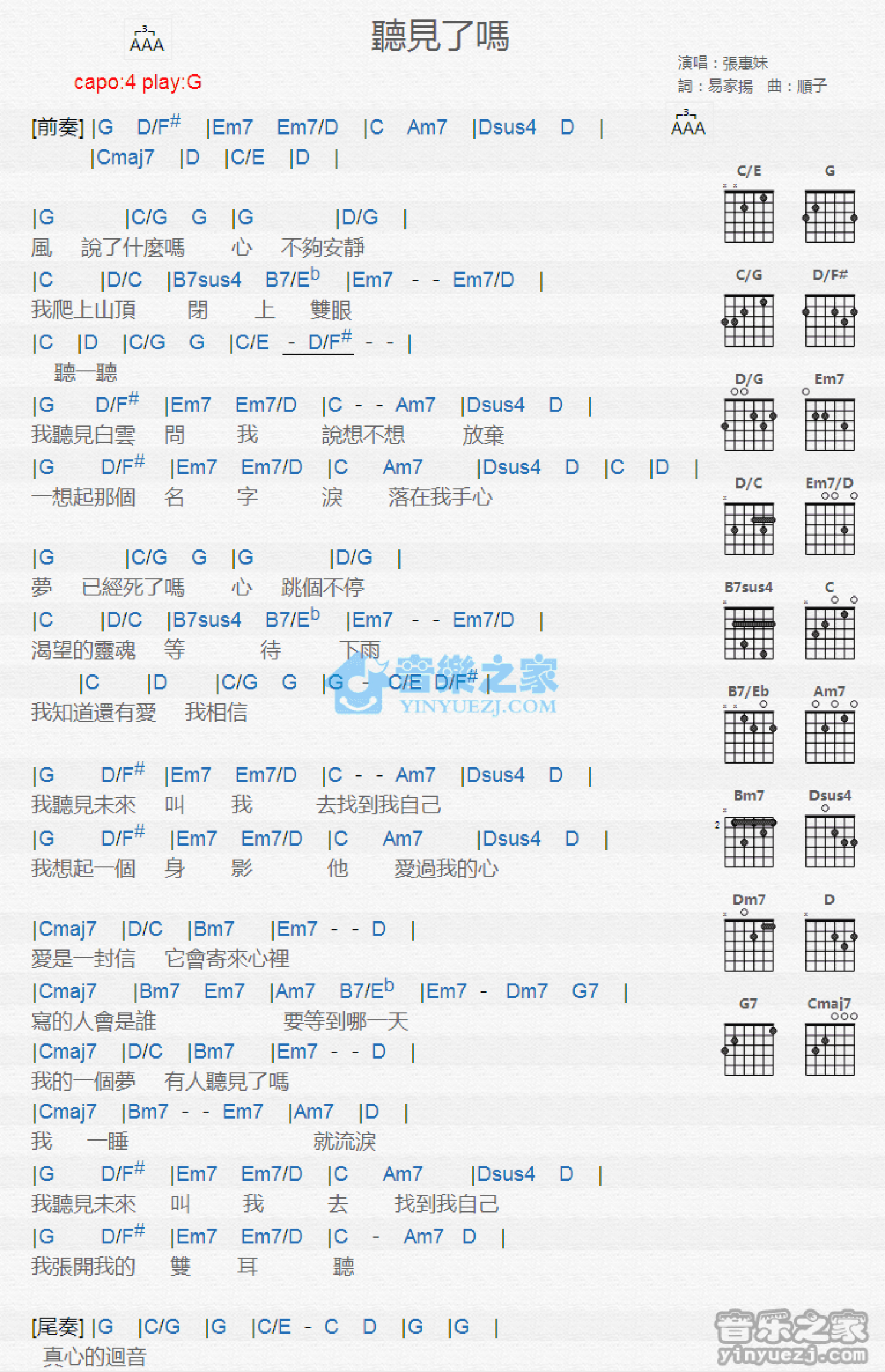 曲谱介绍: G调版《听见了吗》吉他和弦弹唱谱