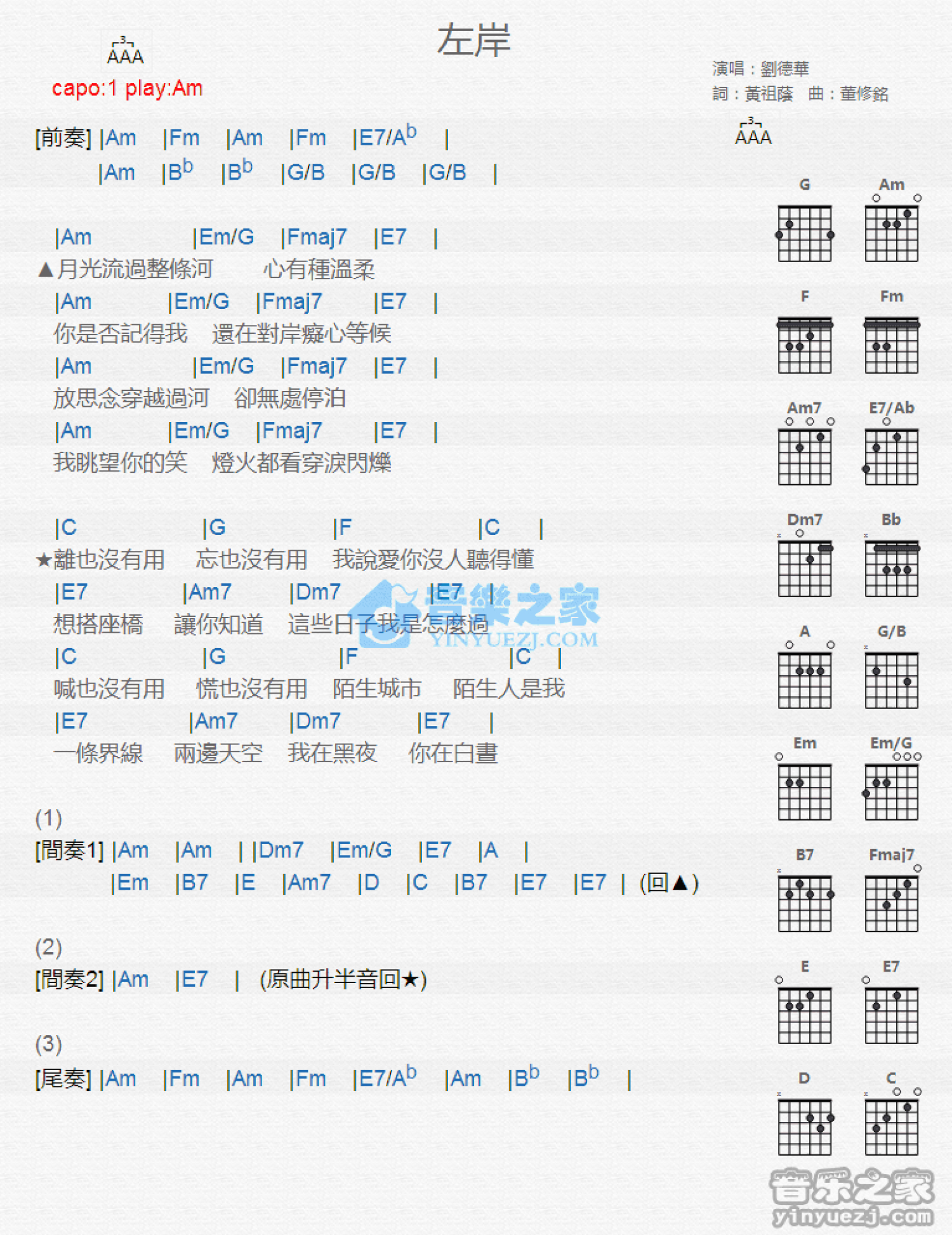 曲谱介绍: Am调版《左岸》吉他和弦弹唱谱