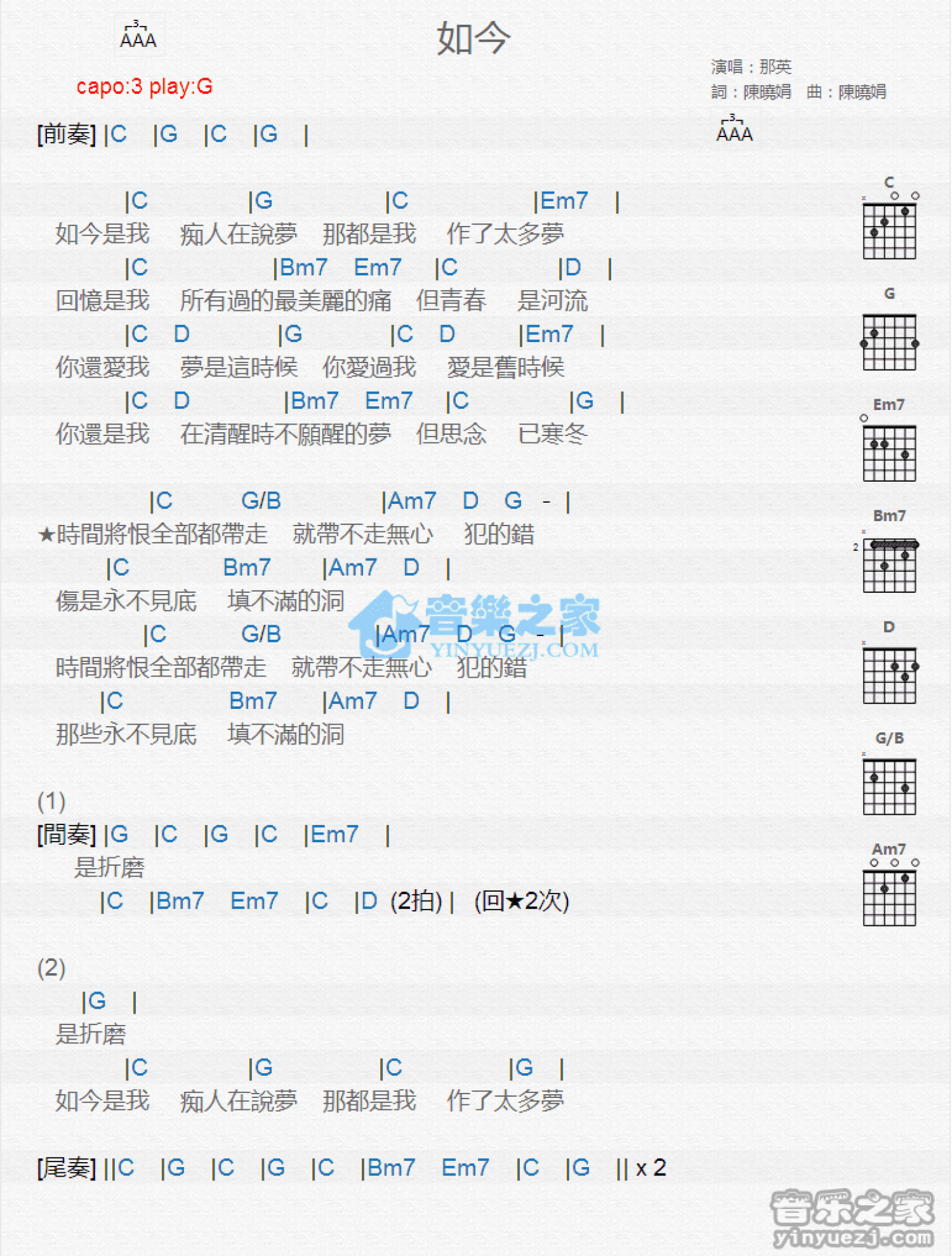 曲谱介绍: G调版《如今》吉他和弦弹唱谱