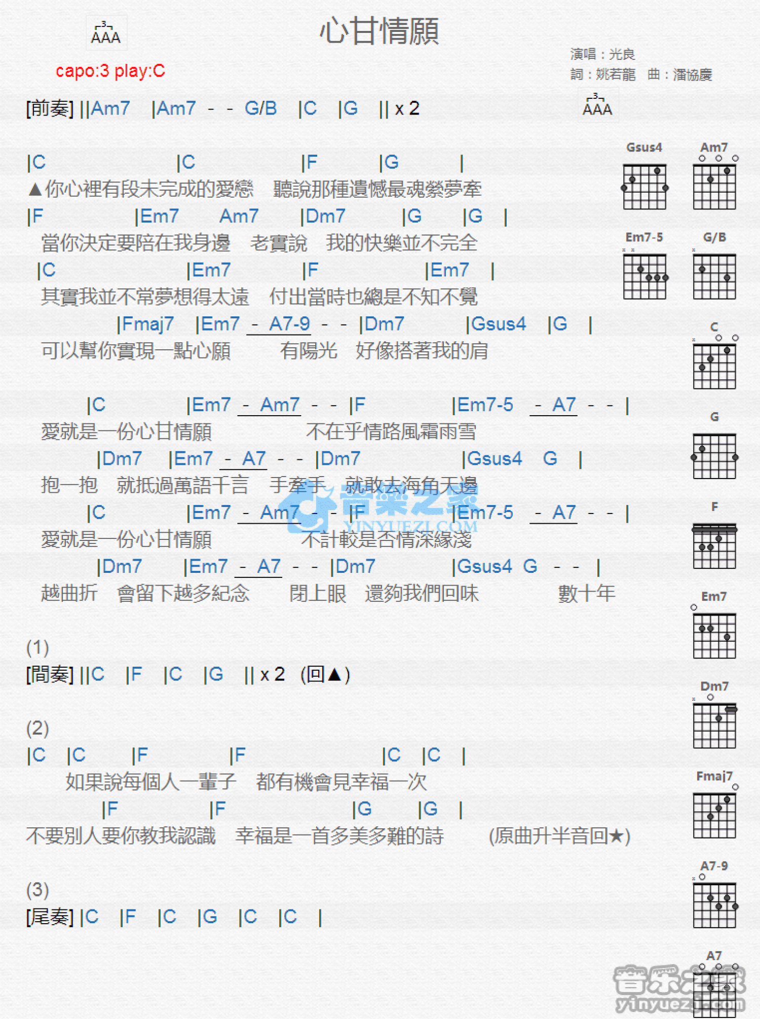 曲谱介绍: C调版《心甘情愿》吉他和弦弹唱谱