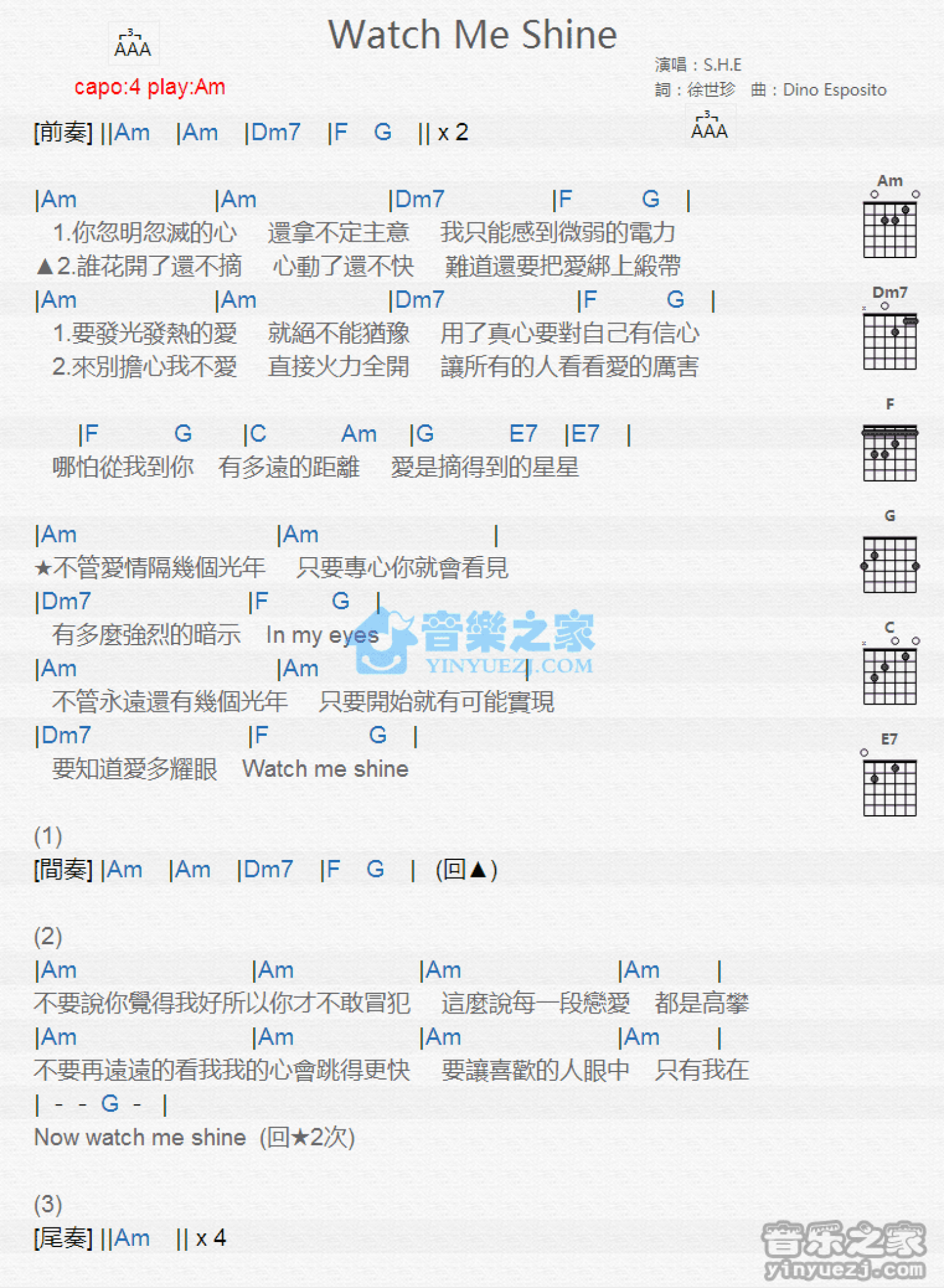 曲谱介绍: Am调版《WatchMeShine》吉他和弦弹唱谱