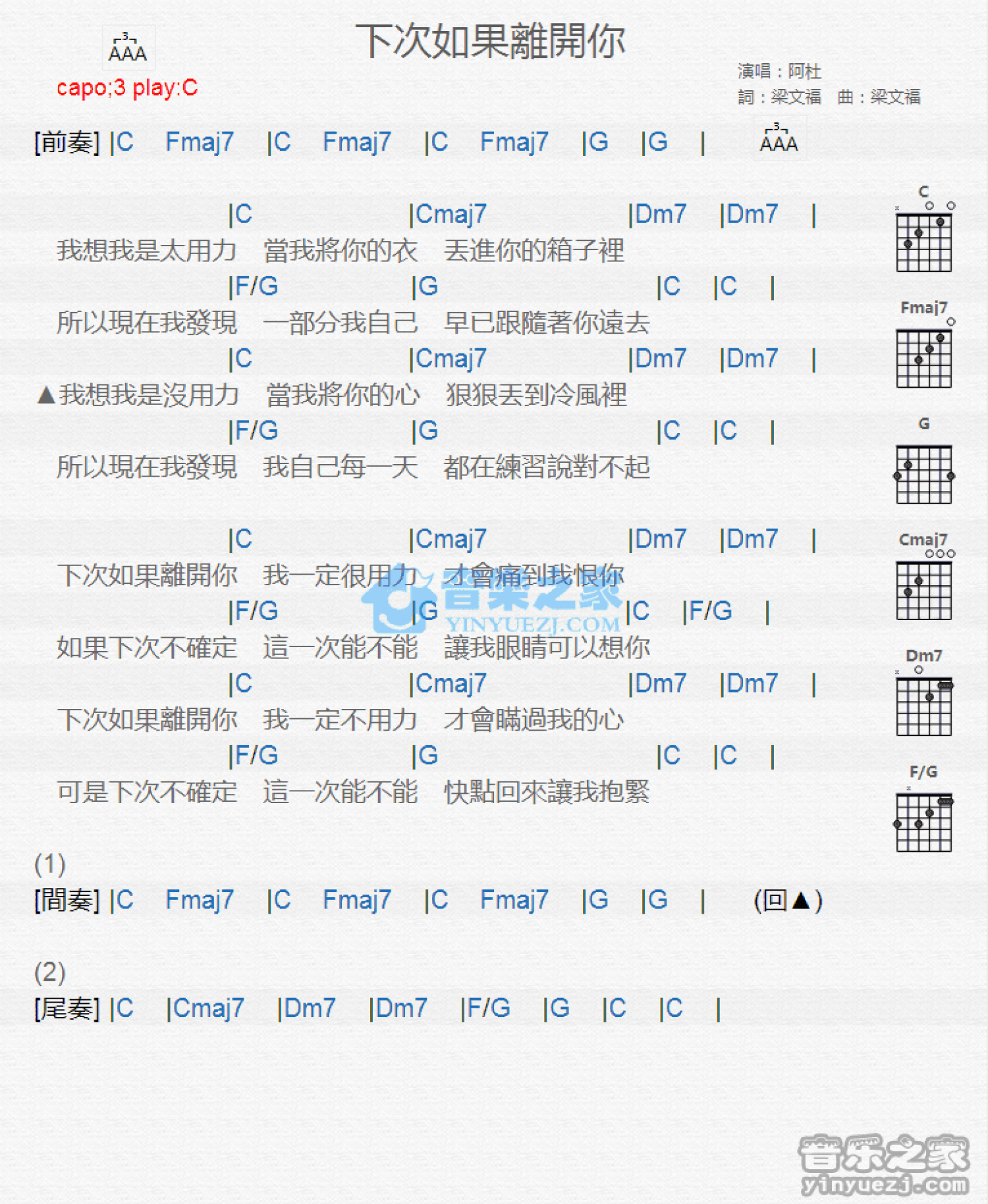 曲谱介绍: C调版《下次如果离开你》吉他和弦弹唱谱