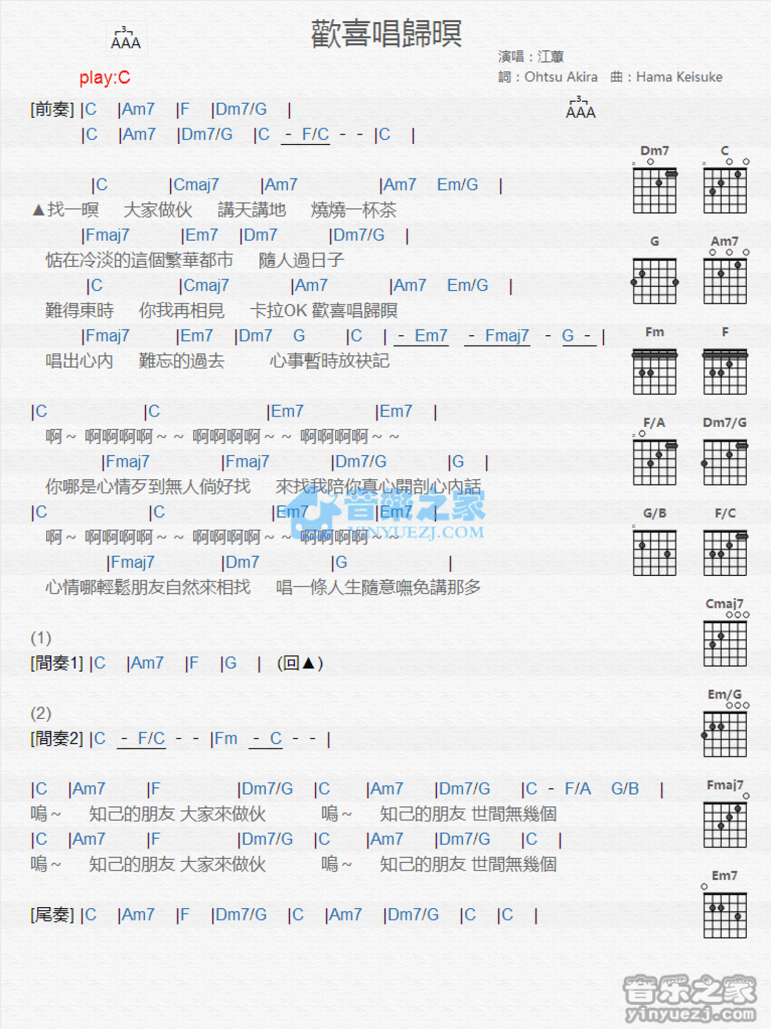 曲谱介绍: C调版《欢喜唱归暝》吉他和弦弹唱谱