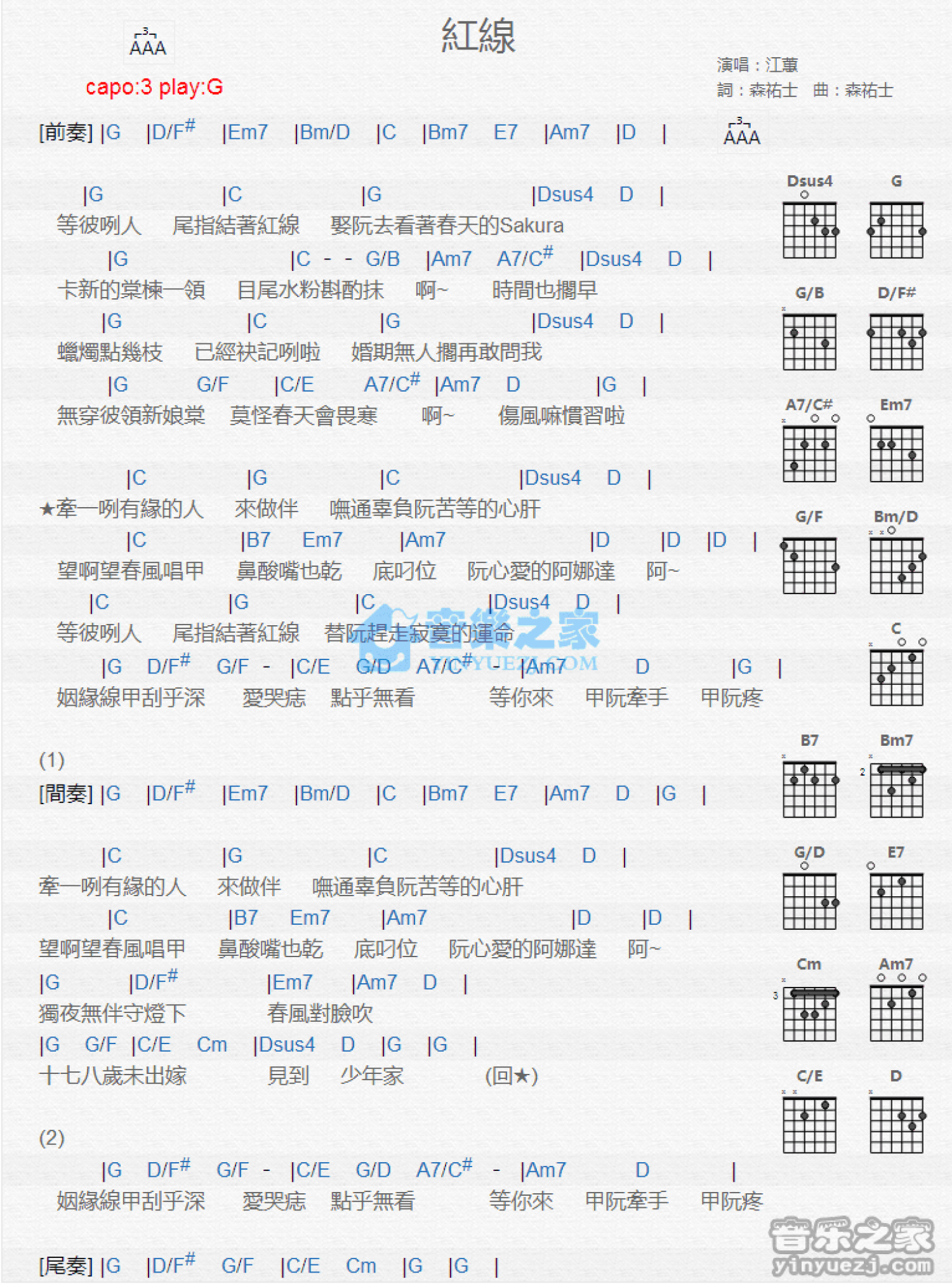 曲谱介绍: G调版《红线》吉他和弦弹唱谱