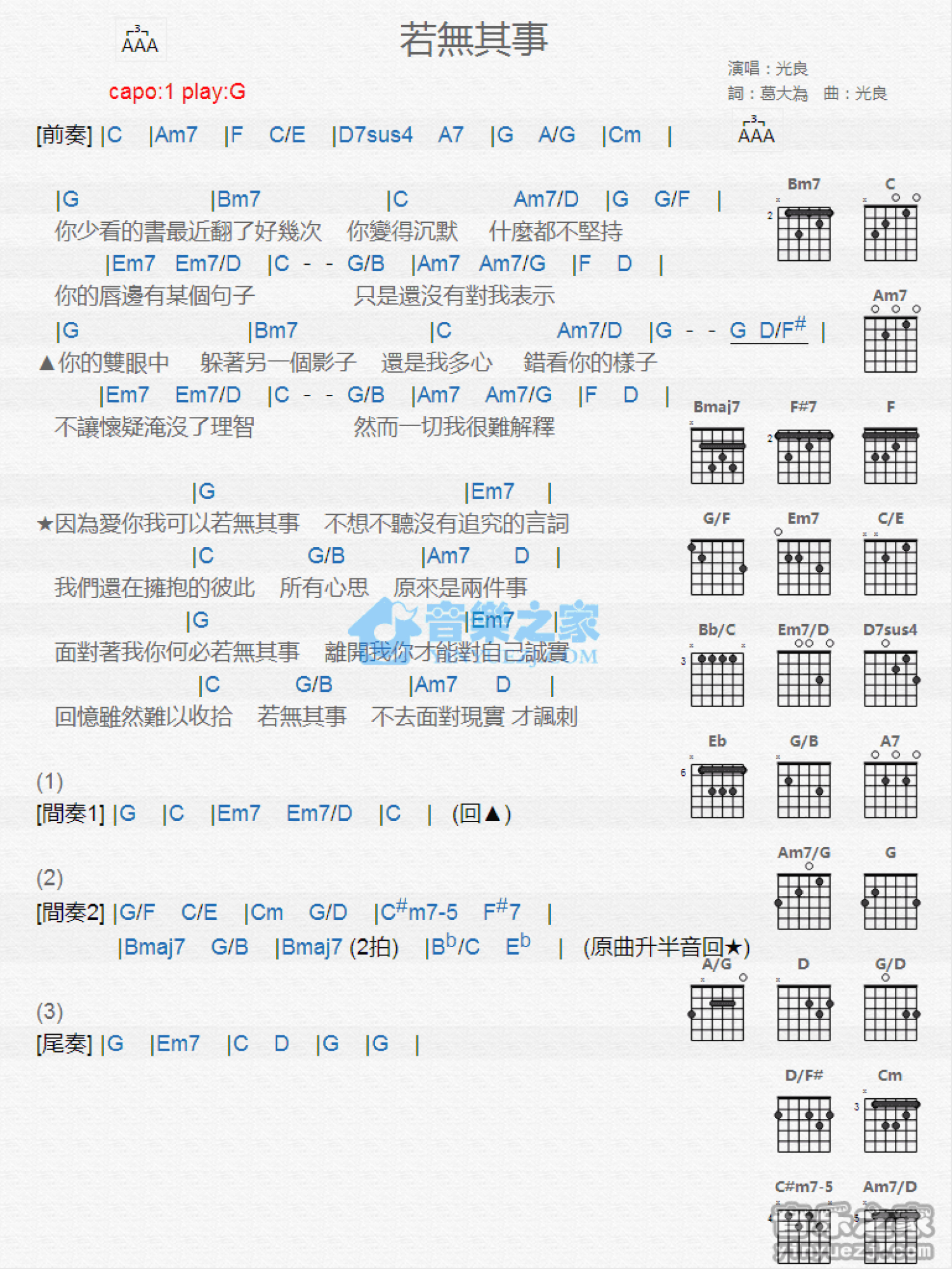 曲谱介绍: G调版《若无其事》吉他和弦弹唱谱