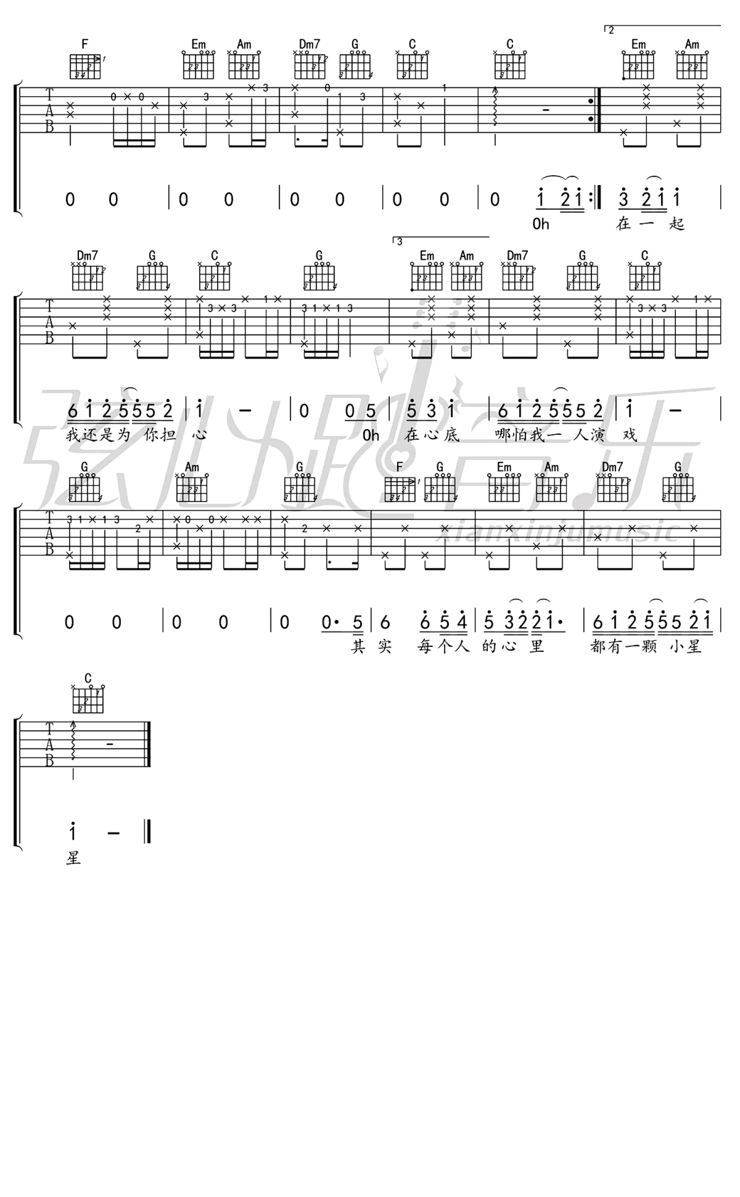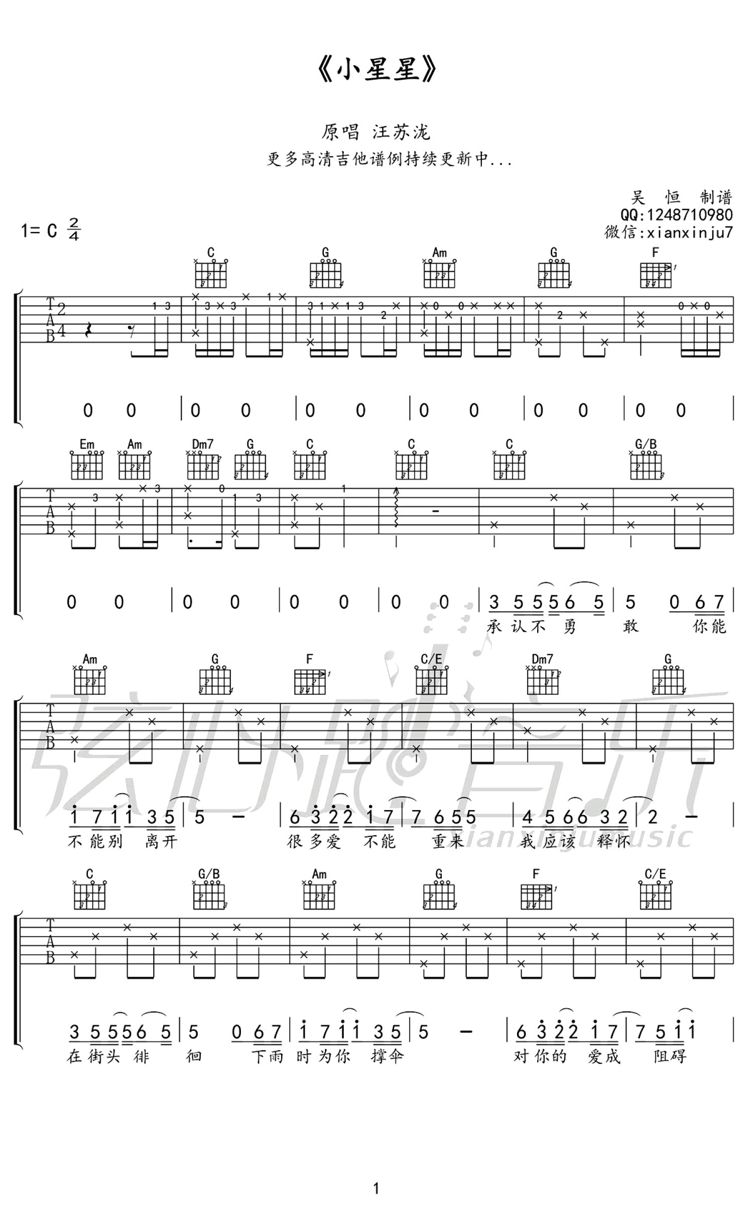 小星星吉他谱 - 汪苏泷 - C调吉他弹唱谱