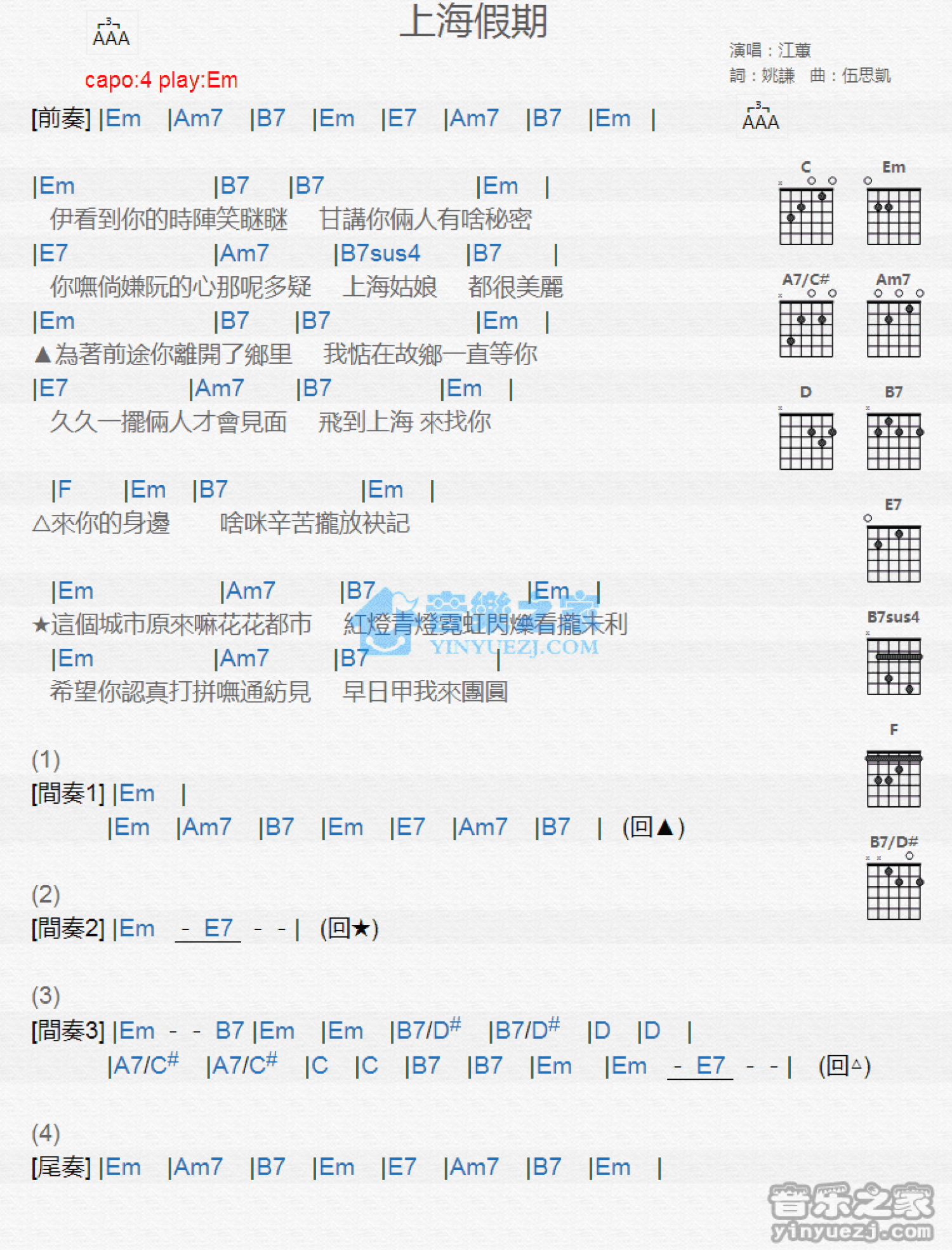 曲谱介绍: Em调版 江蕙《上海假期》吉他和弦弹唱谱