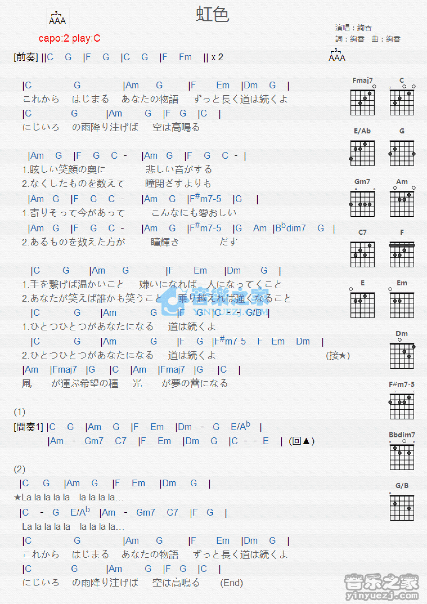 曲谱介绍: C调版 绚香《虹色》吉他和弦弹唱谱
