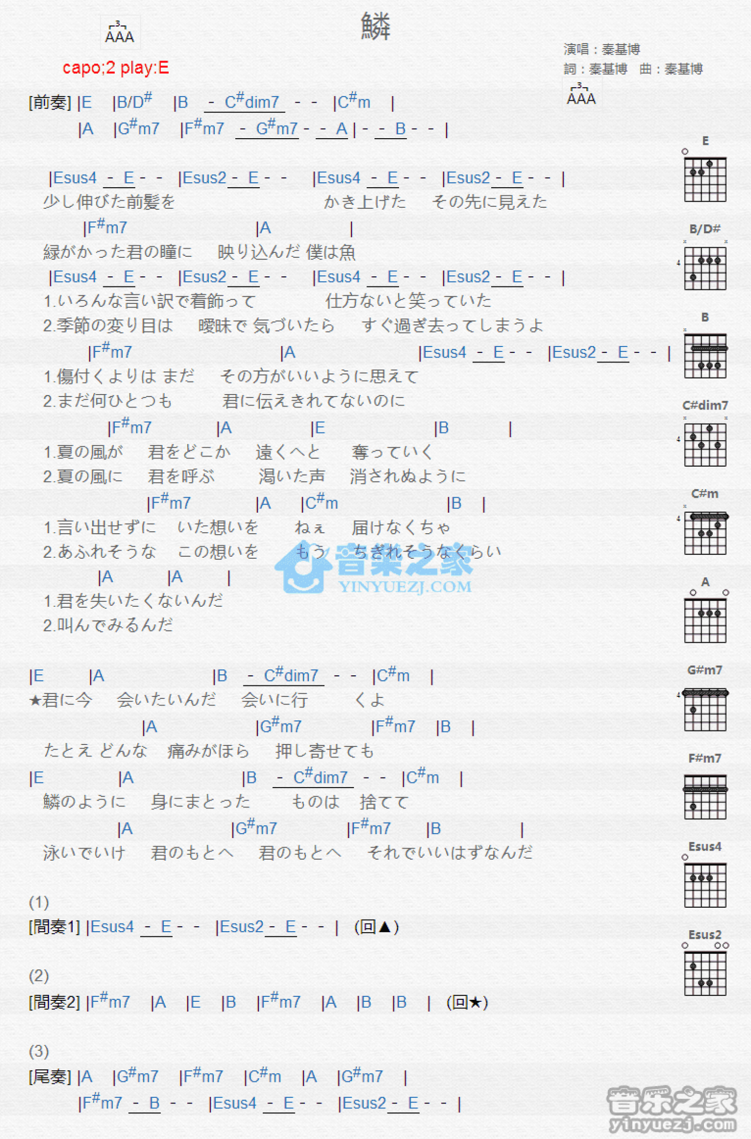曲谱介绍: E调版 秦基博《鳞》吉他和弦弹唱谱