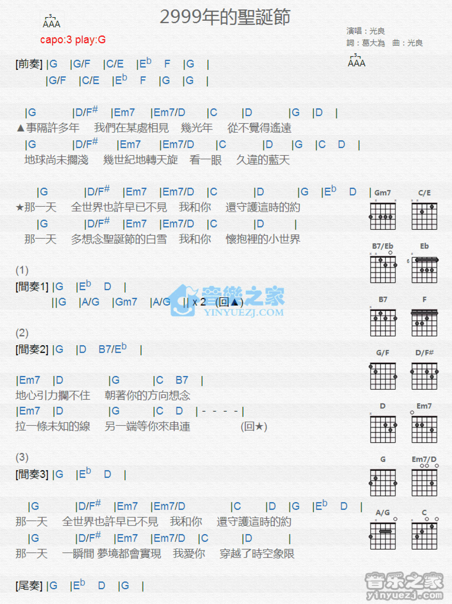 曲谱介绍: G调版 光良《2999年的圣诞节》吉他和弦弹唱谱