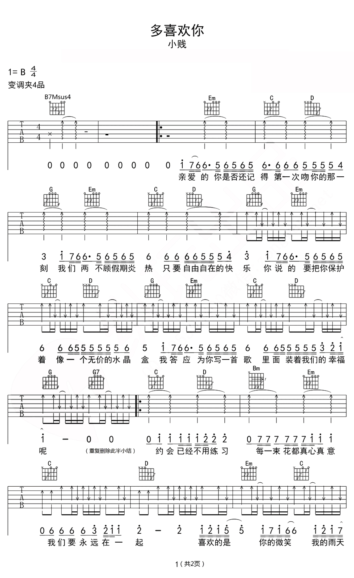 多喜欢你吉他谱 - 小贱 - G调吉他弹唱谱