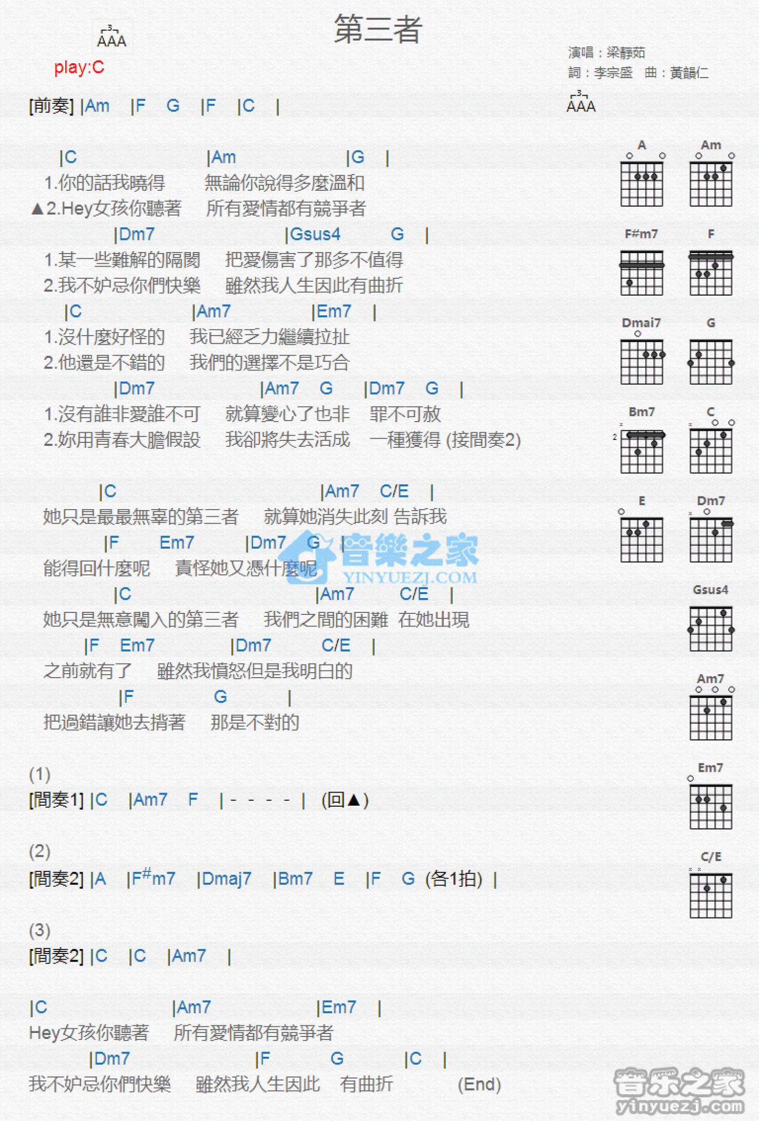曲谱介绍: C调版梁静茹《第三者》吉他和弦弹唱谱