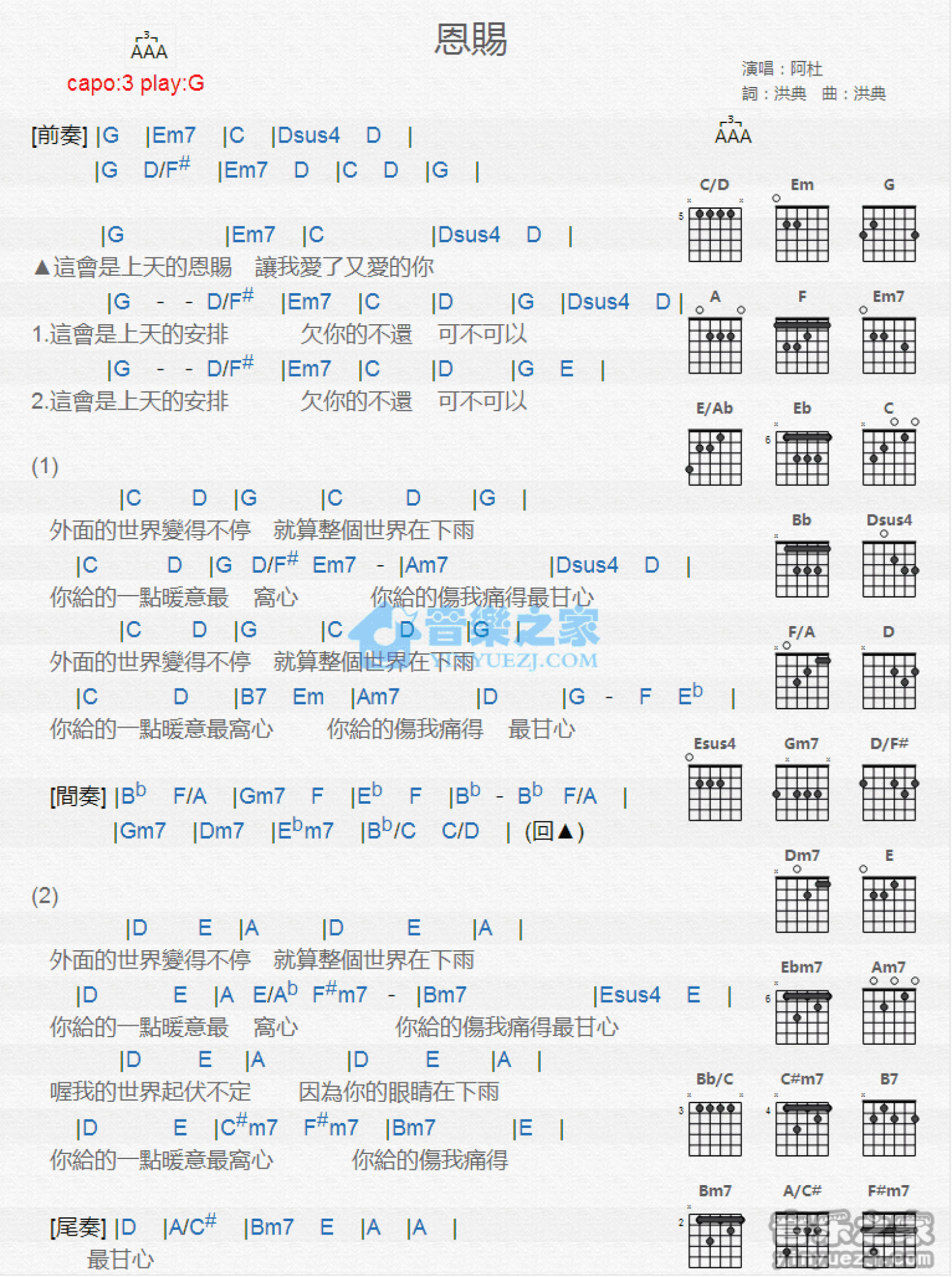 曲谱介绍: G调版《恩赐》吉他和弦弹唱谱