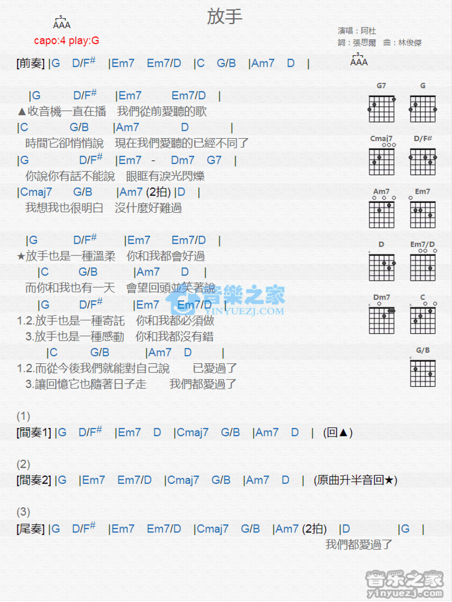 曲谱介绍: G调版《放手》吉他和弦弹唱谱