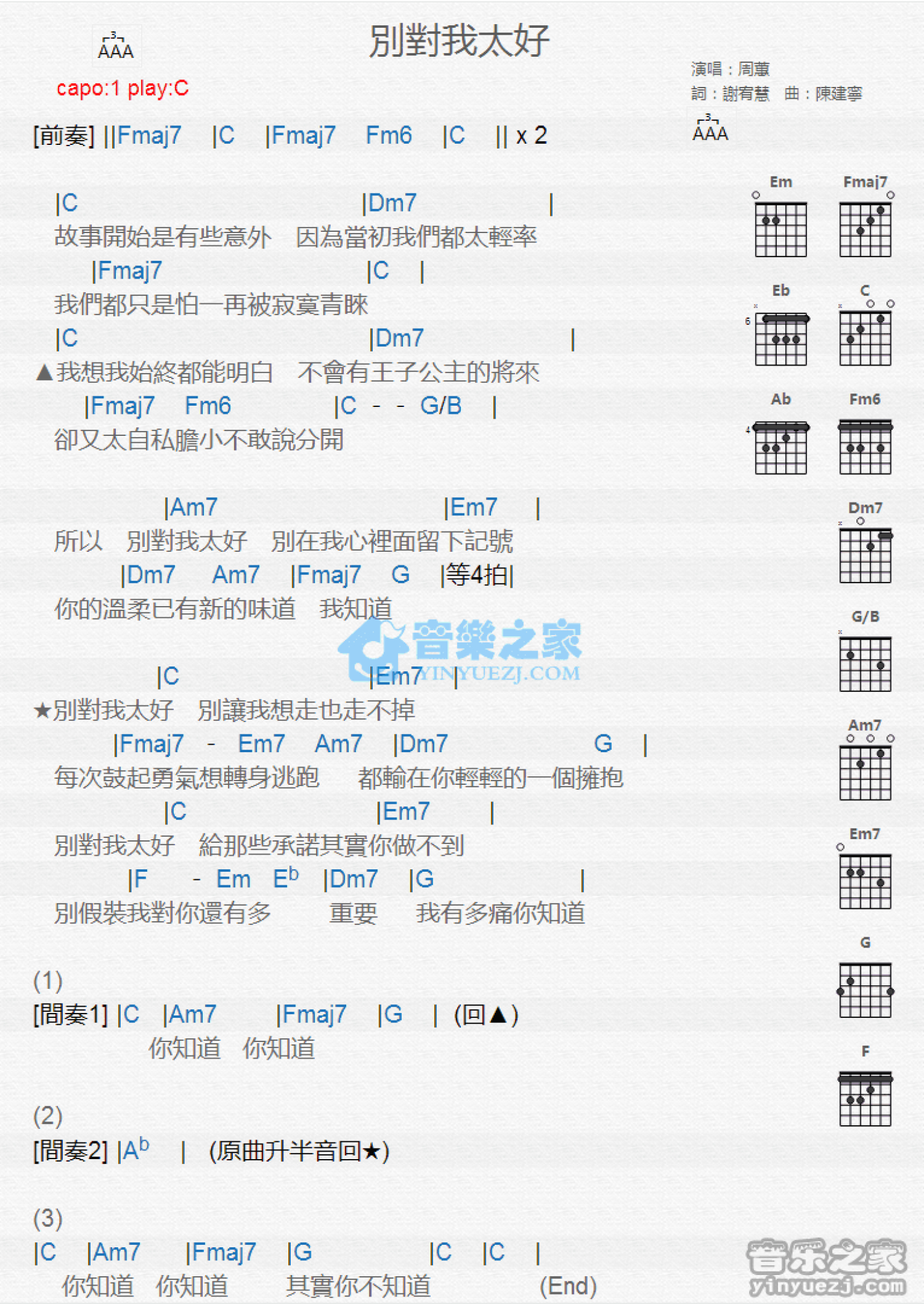 曲谱介绍: C调版《别对我太好》吉他和弦弹唱谱
