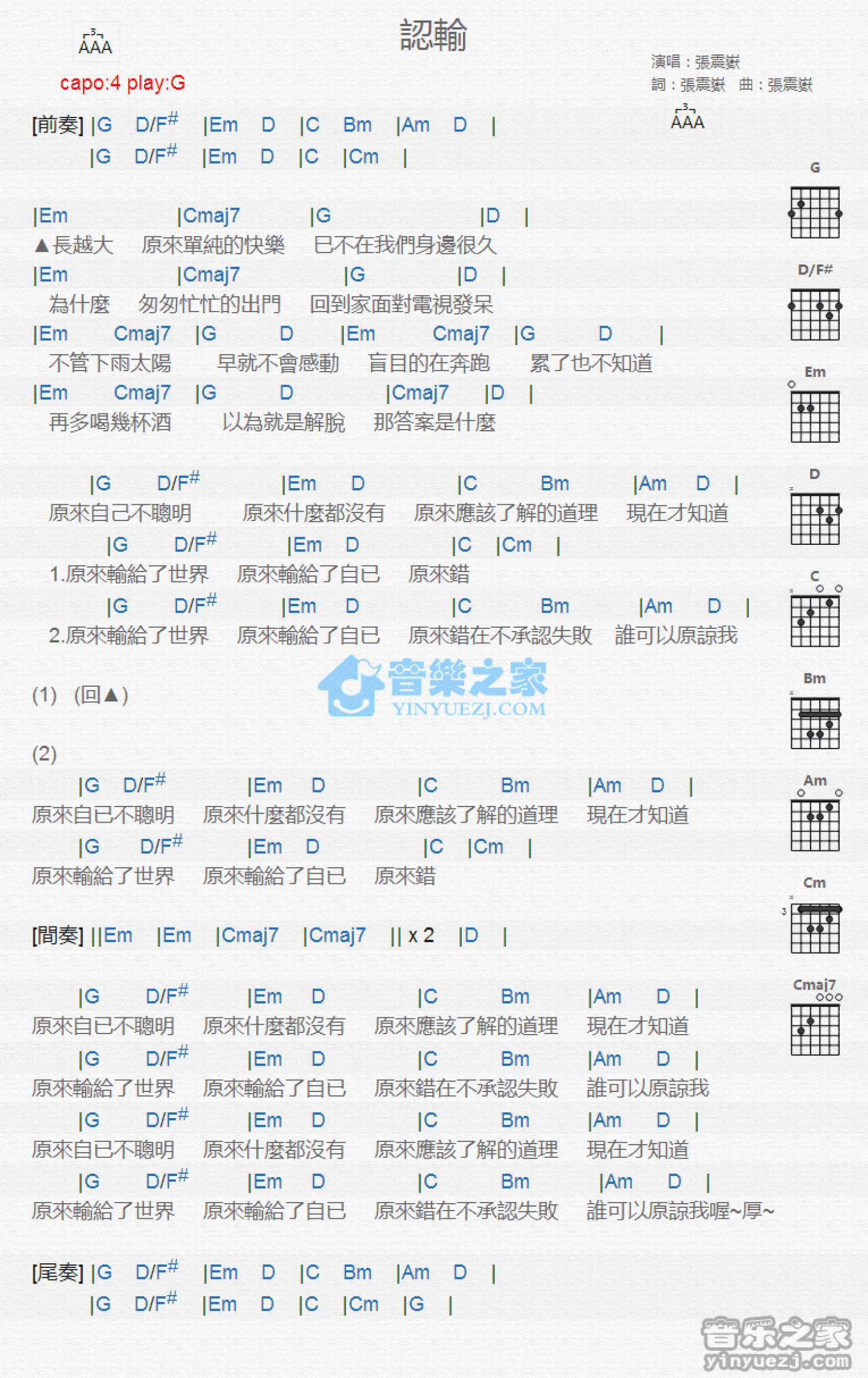 曲谱介绍: G调版《认输》吉他和弦弹唱谱