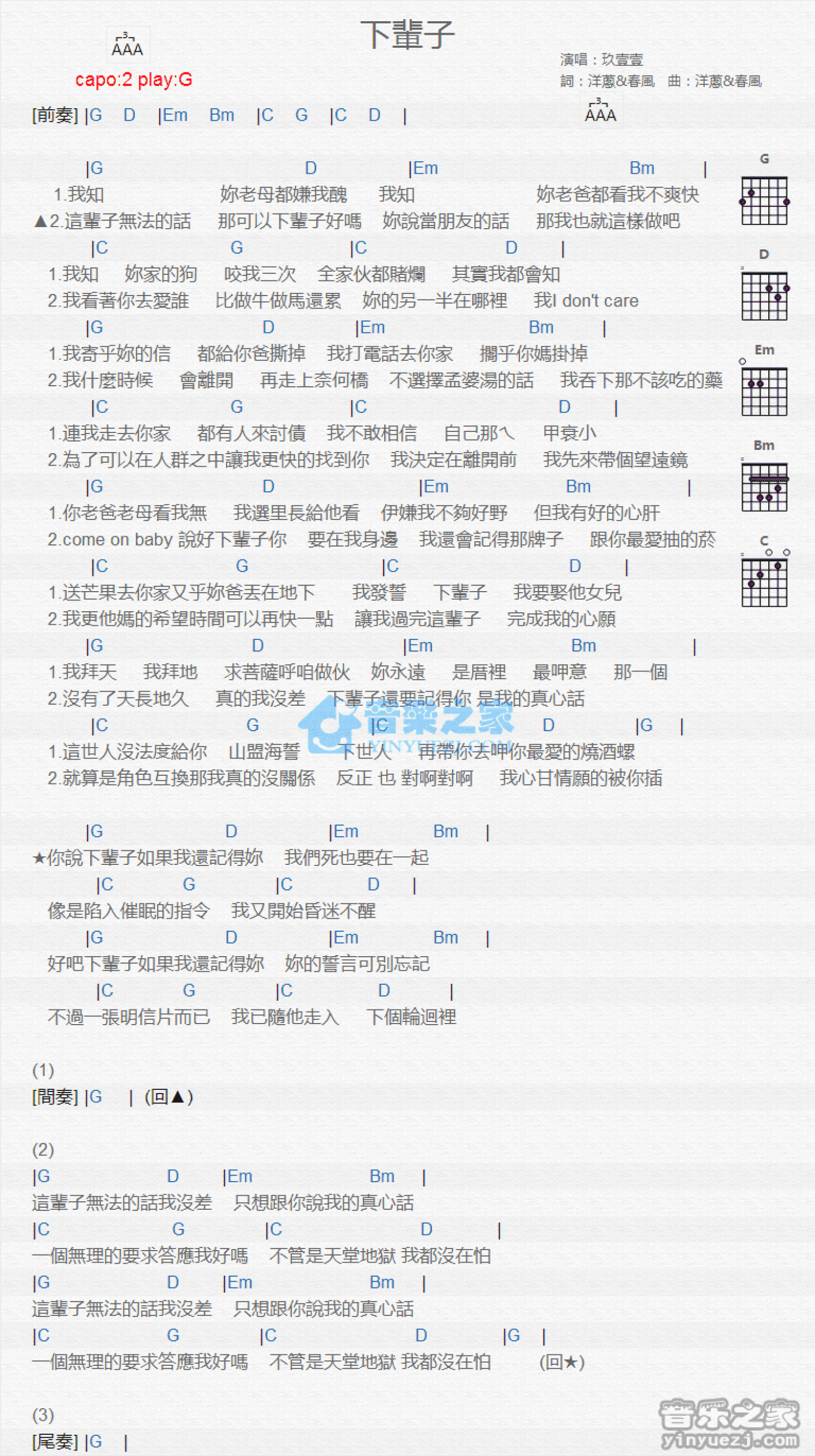 曲谱介绍: G调版 玖壹壹《下辈子》吉他和弦弹唱谱