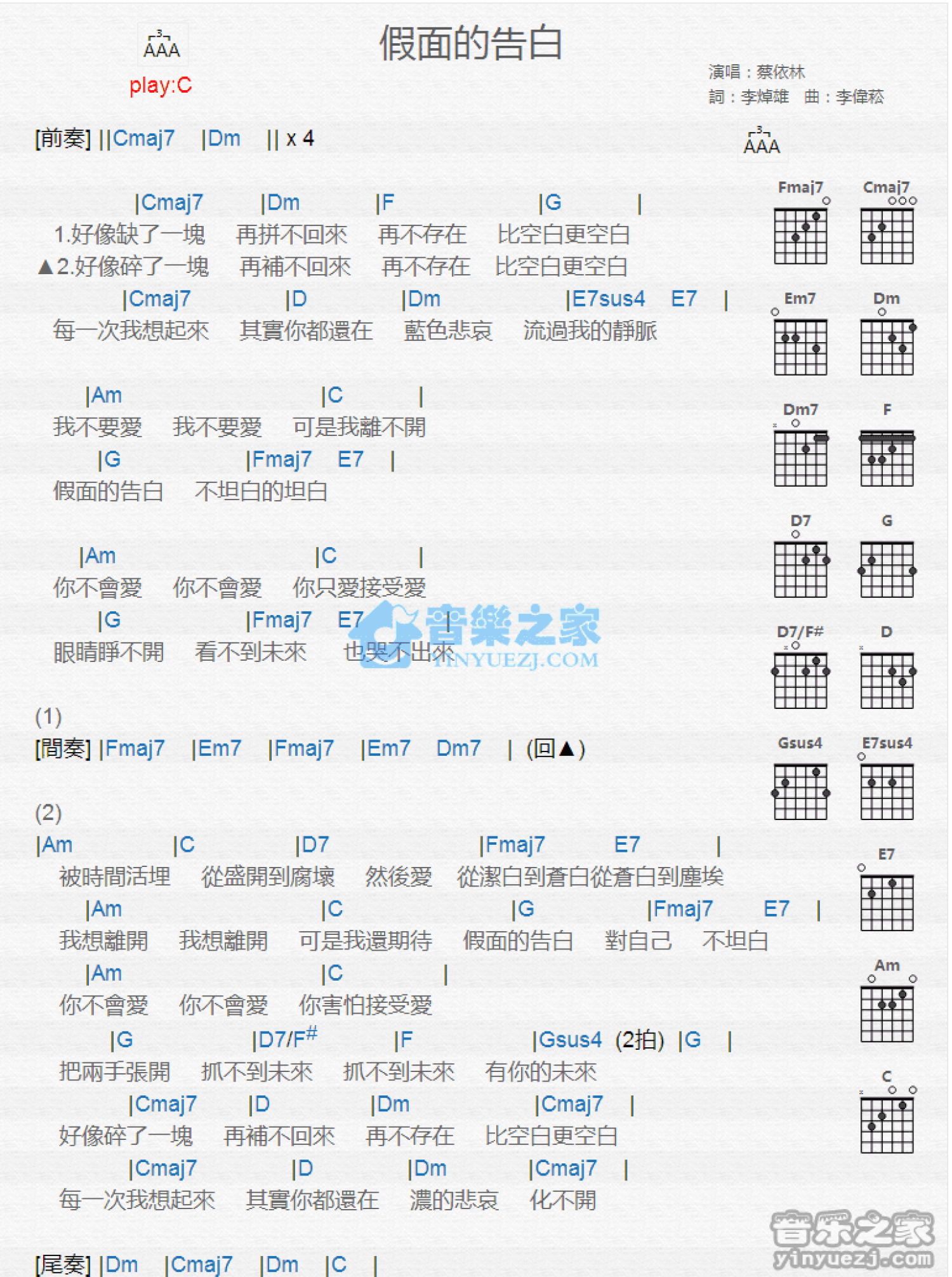 曲谱介绍: C调版 蔡依林《假面的告白》吉他和弦弹唱谱