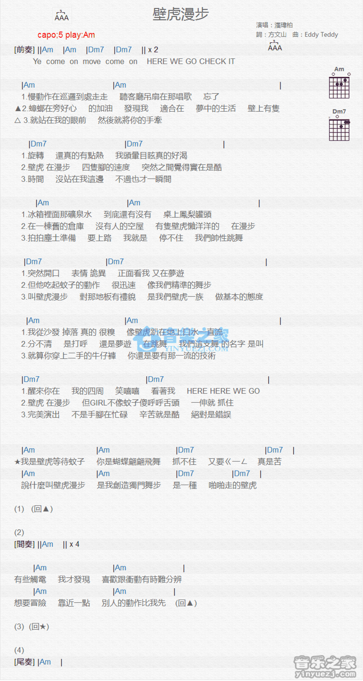 曲谱介绍: Am调版 潘玮柏《壁虎漫步》吉他和弦弹唱谱